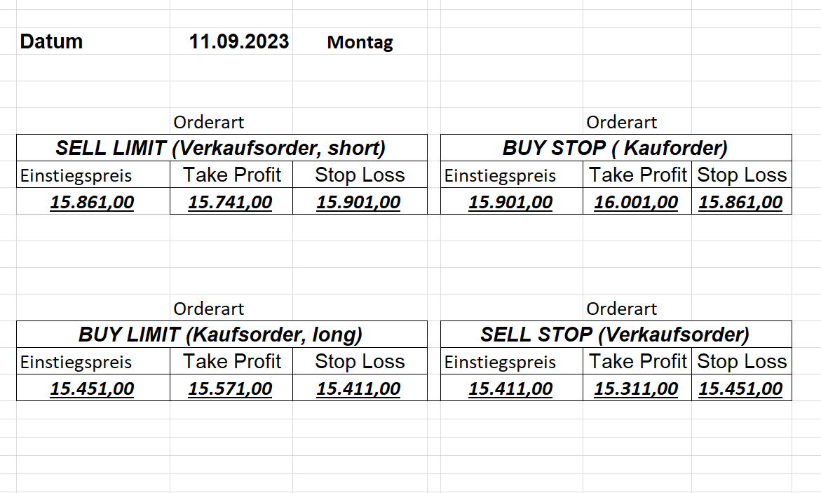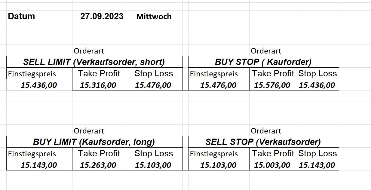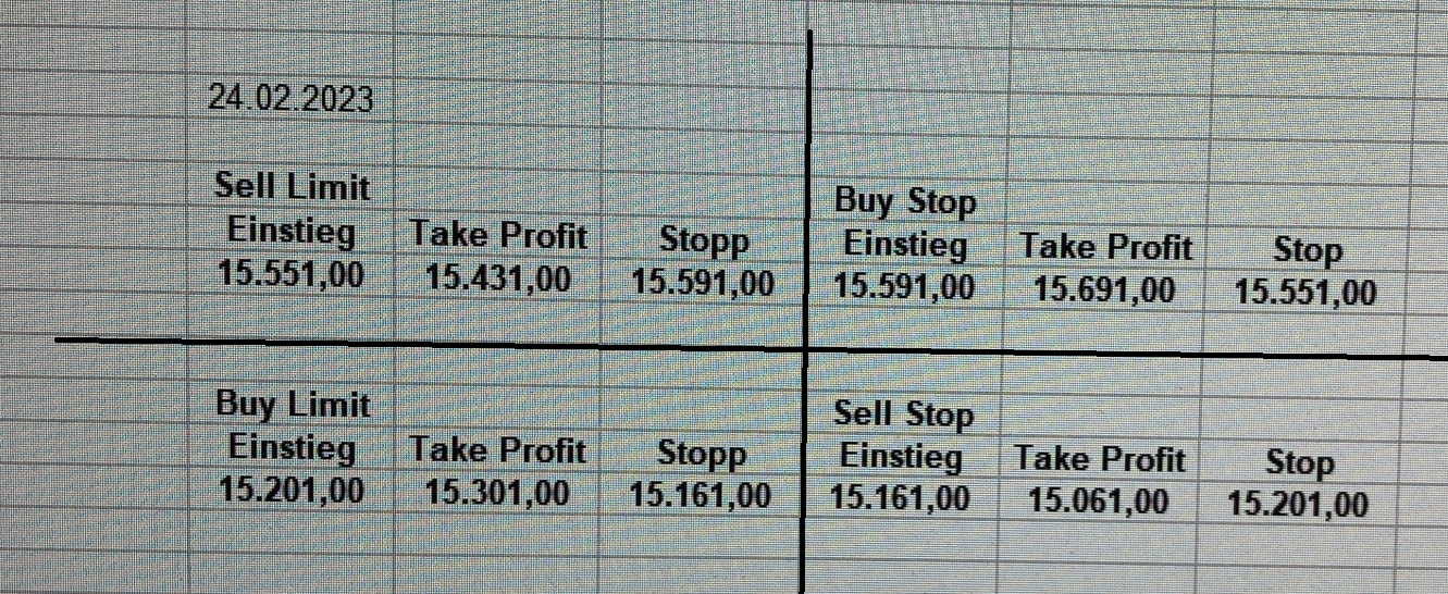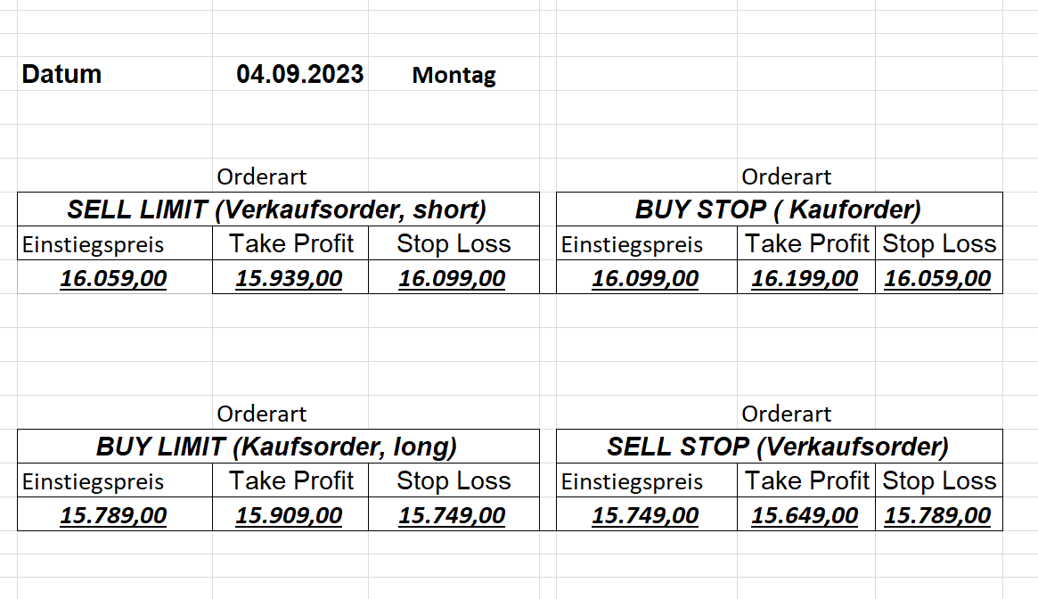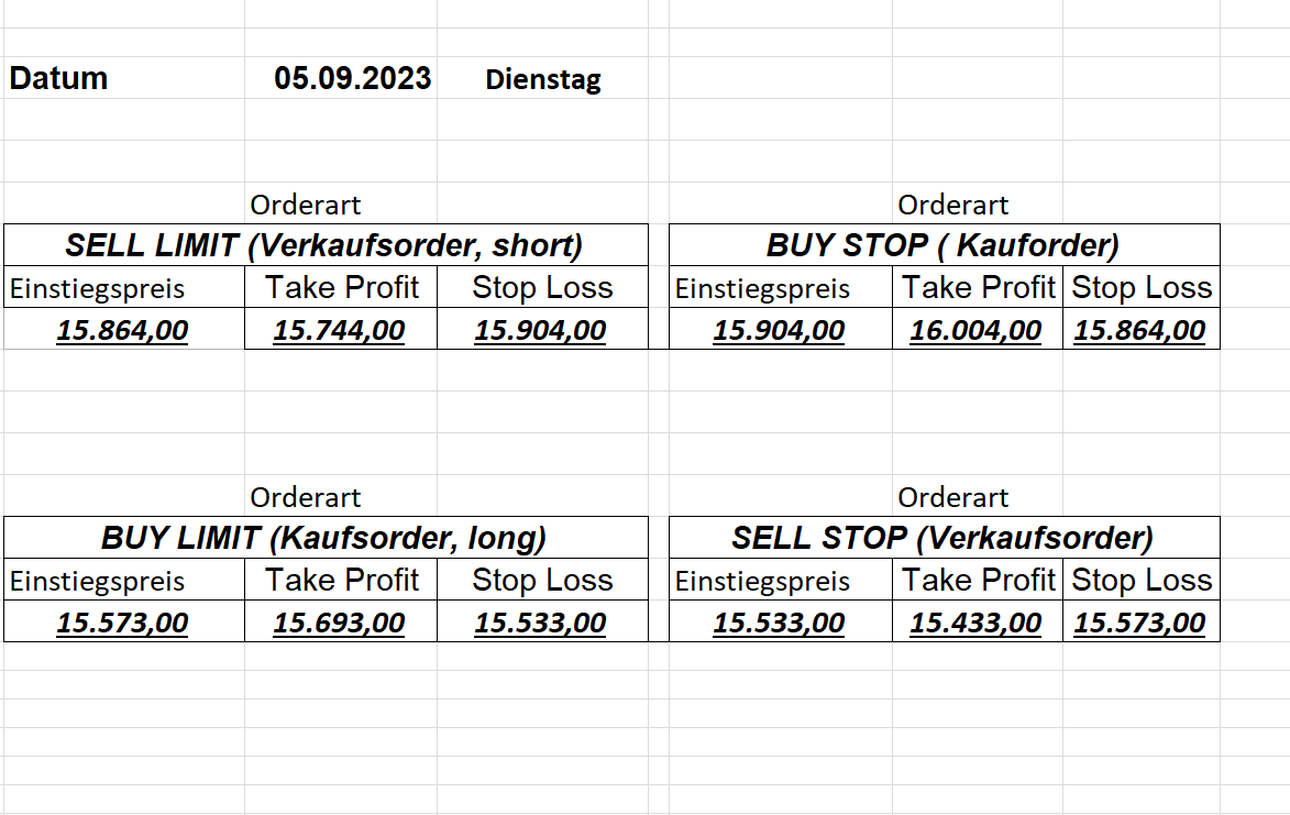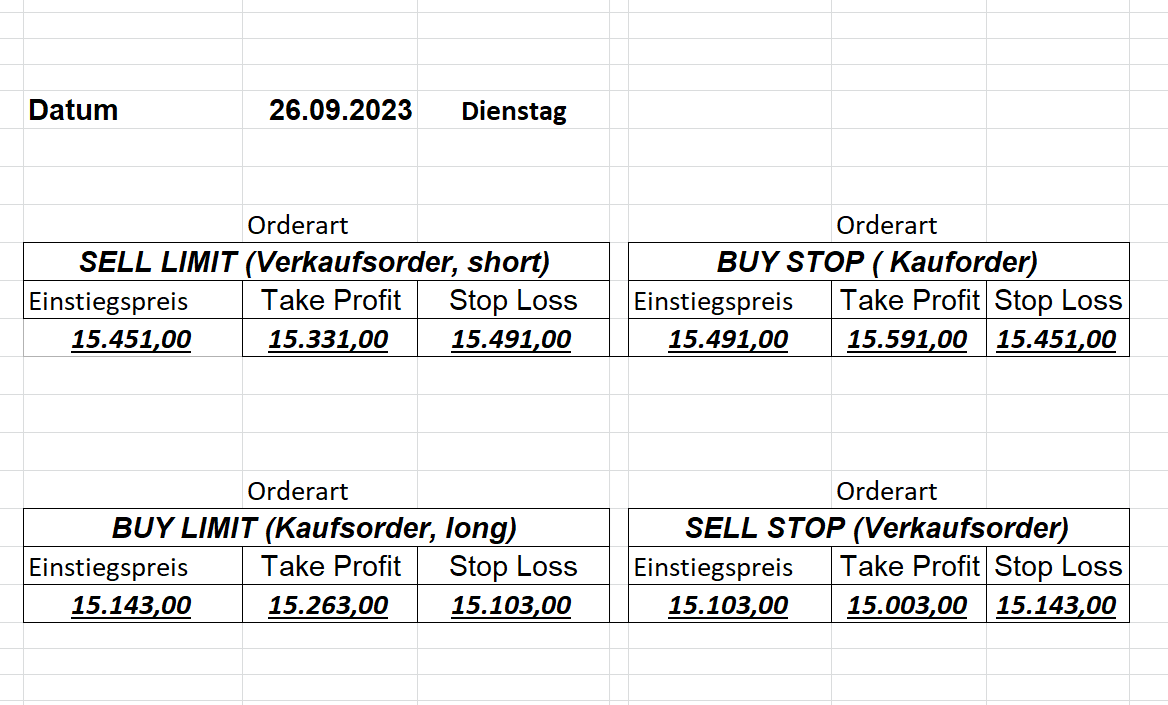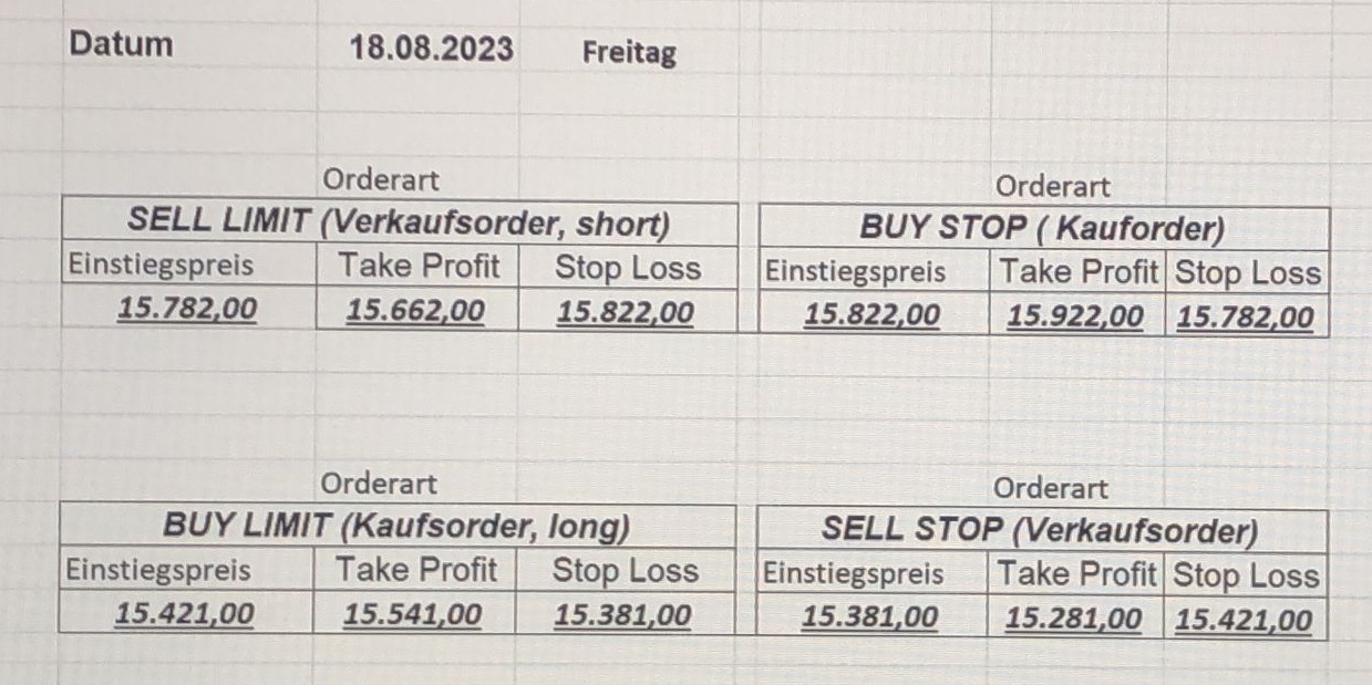 22.9.2023 Platzieren Sie die  Order bis 9:00 Löschen Sie bitte offene Order und Positionen um 21:45 ! Zur Frage der Punktgröße: Beispielrechnung: Bitte immer kurz auf den am weitest entfernten Stopp schauen. Diese Punktzahl sollte nicht mehr als 0,5% bis 1% des Kapitals ausmachen. 21.9.2023 Platzieren Sie die  Order bis 9:00 Löschen Sie bitte offene Order und Positionen um 21:45 ! Zur Frage der Punktgröße: Beispielrechnung: Bitte immer kurz auf den am weitest entfernten Stopp schauen. Diese Punktzahl sollte nicht mehr als 0,5% bis 1% des Kapitals ausmachen. 20.9.2023 Platzieren Sie die  Order bis 9:00 Löschen Sie bitte offene Order und Positionen um 21:45 ! Zur Frage der Punktgröße: Beispielrechnung: Bitte immer kurz auf den am weitest entfernten Stopp schauen. Diese Punktzahl sollte nicht mehr als 0,5% bis 1% des Kapitals ausmachen. 19.9.2023 Platzieren Sie die  Order bis 9:00 Löschen Sie bitte offene Order und Positionen um 21:45 ! Zur Frage der Punktgröße: Beispielrechnung: Bitte immer kurz auf den am weitest entfernten Stopp schauen. Diese Punktzahl sollte nicht mehr als 0,5% bis 1% des Kapitals ausmachen. So langsam kann ich wieder „kriechen“. Corona ist wirklich anstrengend. Zum FDAX: Wir haben ein Ergebnis: Es wird der „Kleine“ mit einem Euro pro Punkt. Wenn es weiter mit der Genesung vorangeht, werden wir am kommenden Montag endlich starten.  Achtung: Beim Buy Limit und beim Stopp Sell bitte die 16 durch 15 ersetzen. Also Buy Limit 15451 /15571/15411 Stopp Sell 15411/ 15311/ 15451 18.9.2023 Platzieren Sie die  Order bis 9:00 Löschen Sie bitte offene Order und Positionen um 21:45 ! Zur Frage der Punktgröße: Beispielrechnung: Bitte immer kurz auf den am weitest entfernten Stopp schauen. Diese Punktzahl sollte nicht mehr als 0,5% bis 1% des Kapitals ausmachen. 15.9.2023 Platzieren Sie die  Order bis 9:00 Löschen Sie bitte offene Order und Positionen um 21:45 ! Zur Frage der Punktgröße: Beispielrechnung: Bitte immer kurz auf den am weitest entfernten Stopp schauen. Diese Punktzahl sollte nicht mehr als 0,5% bis 1% des Kapitals ausmachen. 14.9.2023 Platzieren Sie die  Order bis 9:00 Löschen Sie bitte offene Order und Positionen um 21:45 ! Zur Frage der Punktgröße: Beispielrechnung: Bitte immer kurz auf den am weitest entfernten Stopp schauen. Diese Punktzahl sollte nicht mehr als 0,5% bis 1% des Kapitals ausmachen. 13.9.2023 Heute „spuckte“ das System keine tragfähigen Signale aus. Morgen geht es normal weiter!  12.9.2023