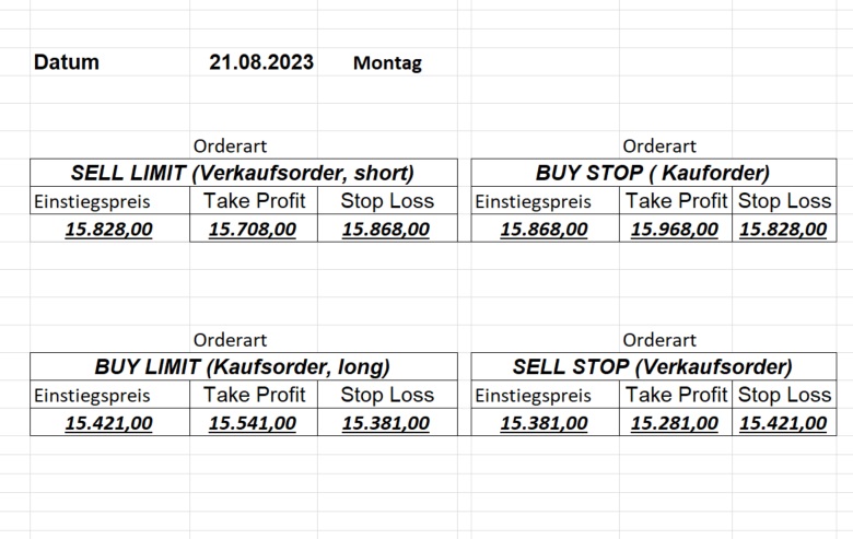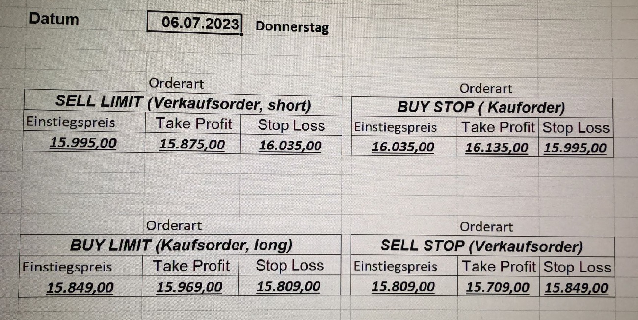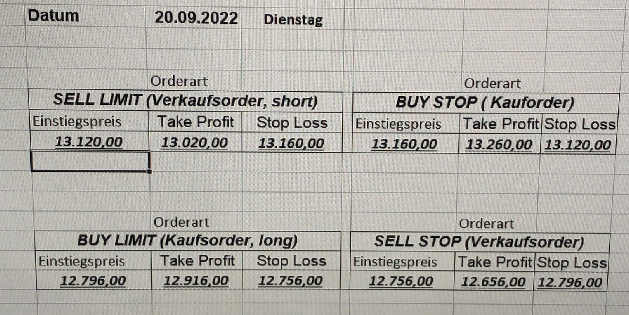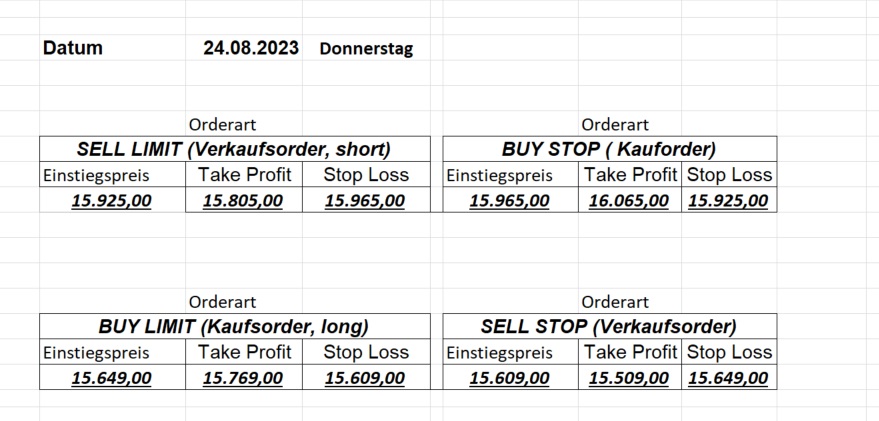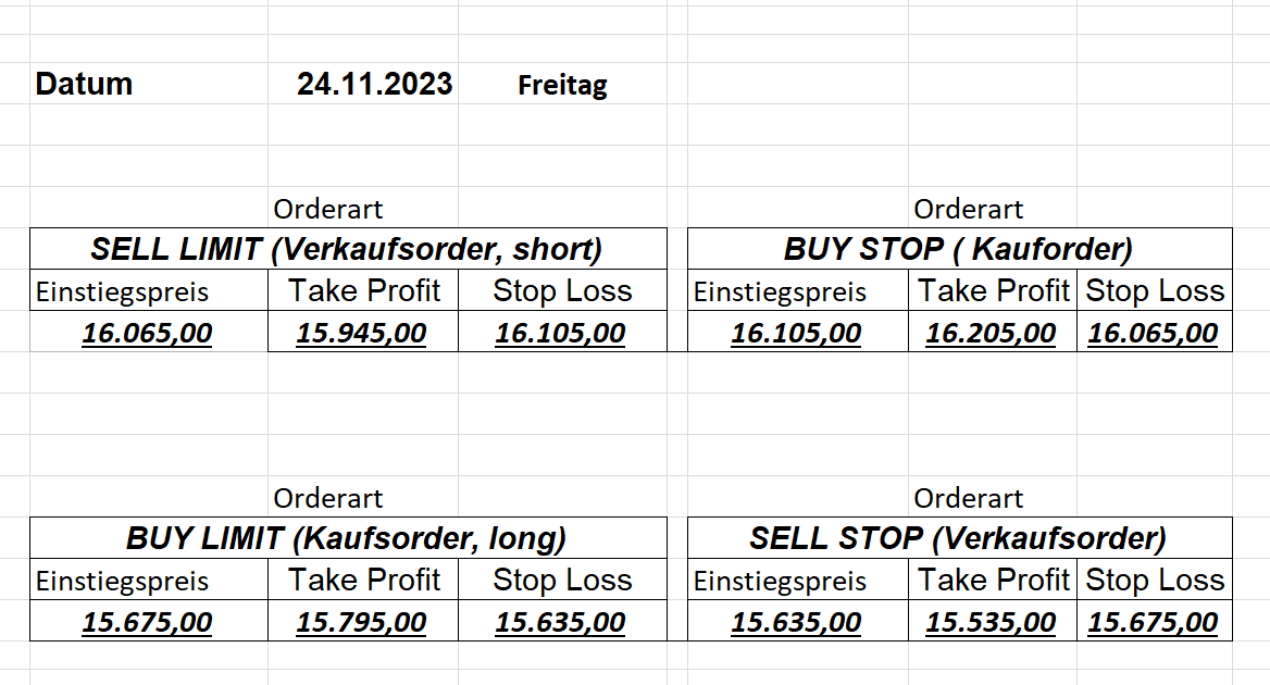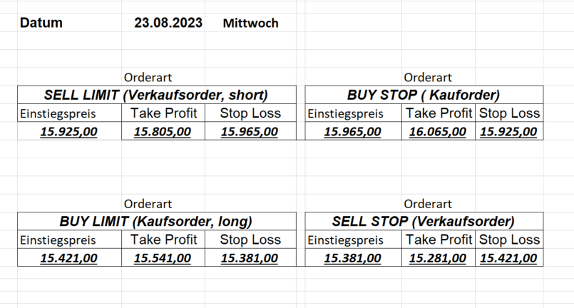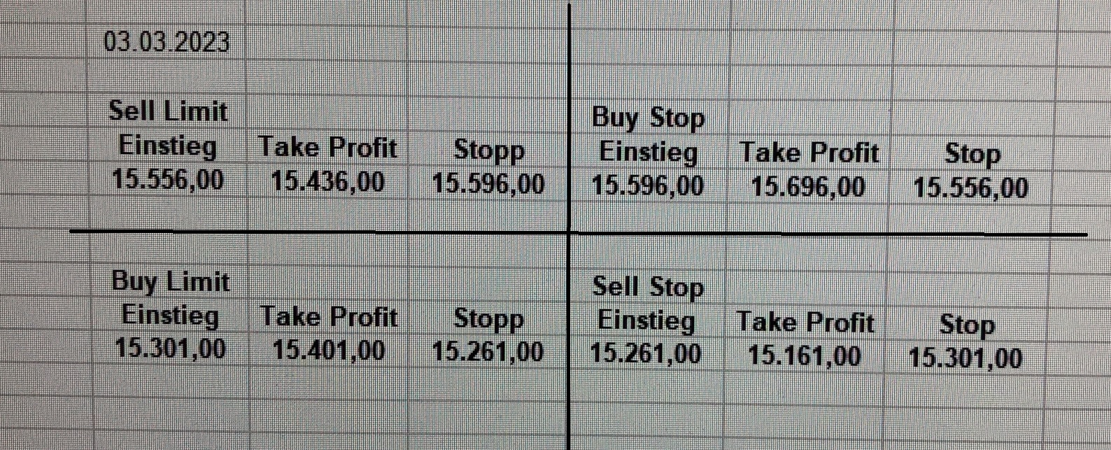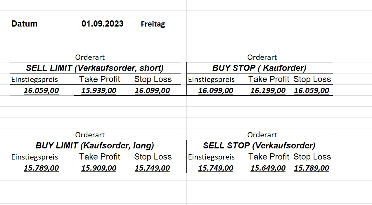 22.9.2023 Platzieren Sie die  Order bis 9:00 Löschen Sie bitte offene Order und Positionen um 21:45 ! Zur Frage der Punktgröße: Beispielrechnung: Bitte immer kurz auf den am weitest entfernten Stopp schauen. Diese Punktzahl sollte nicht mehr als 0,5% bis 1% des Kapitals ausmachen. 21.9.2023 Platzieren Sie die  Order bis 9:00 Löschen Sie bitte offene Order und Positionen um 21:45 ! Zur Frage der Punktgröße: Beispielrechnung: Bitte immer kurz auf den am weitest entfernten Stopp schauen. Diese Punktzahl sollte nicht mehr als 0,5% bis 1% des Kapitals ausmachen. 20.9.2023 Platzieren Sie die  Order bis 9:00 Löschen Sie bitte offene Order und Positionen um 21:45 ! Zur Frage der Punktgröße: Beispielrechnung: Bitte immer kurz auf den am weitest entfernten Stopp schauen. Diese Punktzahl sollte nicht mehr als 0,5% bis 1% des Kapitals ausmachen. 19.9.2023 Platzieren Sie die  Order bis 9:00 Löschen Sie bitte offene Order und Positionen um 21:45 ! Zur Frage der Punktgröße: Beispielrechnung: Bitte immer kurz auf den am weitest entfernten Stopp schauen. Diese Punktzahl sollte nicht mehr als 0,5% bis 1% des Kapitals ausmachen. So langsam kann ich wieder „kriechen“. Corona ist wirklich anstrengend. Zum FDAX: Wir haben ein Ergebnis: Es wird der „Kleine“ mit einem Euro pro Punkt. Wenn es weiter mit der Genesung vorangeht, werden wir am kommenden Montag endlich starten.  Achtung: Beim Buy Limit und beim Stopp Sell bitte die 16 durch 15 ersetzen. Also Buy Limit 15451 /15571/15411 Stopp Sell 15411/ 15311/ 15451 18.9.2023 Platzieren Sie die  Order bis 9:00 Löschen Sie bitte offene Order und Positionen um 21:45 ! Zur Frage der Punktgröße: Beispielrechnung: Bitte immer kurz auf den am weitest entfernten Stopp schauen. Diese Punktzahl sollte nicht mehr als 0,5% bis 1% des Kapitals ausmachen. 15.9.2023 Platzieren Sie die  Order bis 9:00 Löschen Sie bitte offene Order und Positionen um 21:45 ! Zur Frage der Punktgröße: Beispielrechnung: Bitte immer kurz auf den am weitest entfernten Stopp schauen. Diese Punktzahl sollte nicht mehr als 0,5% bis 1% des Kapitals ausmachen. 14.9.2023 Platzieren Sie die  Order bis 9:00 Löschen Sie bitte offene Order und Positionen um 21:45 ! Zur Frage der Punktgröße: Beispielrechnung: Bitte immer kurz auf den am weitest entfernten Stopp schauen. Diese Punktzahl sollte nicht mehr als 0,5% bis 1% des Kapitals ausmachen. 13.9.2023 Heute „spuckte“ das System keine tragfähigen Signale aus. Morgen geht es normal weiter!  12.9.2023