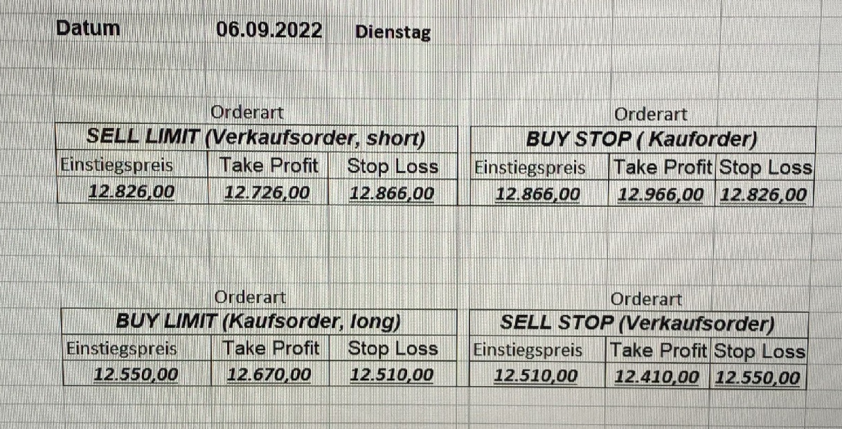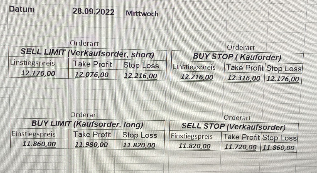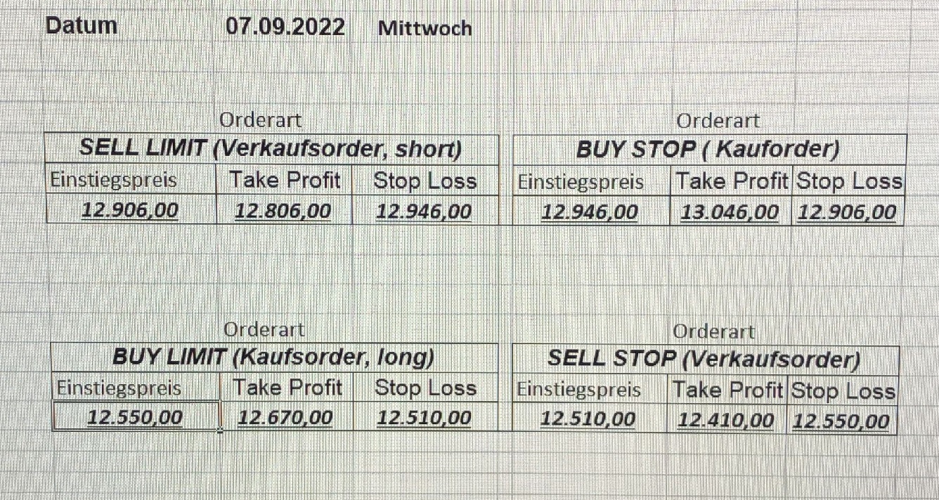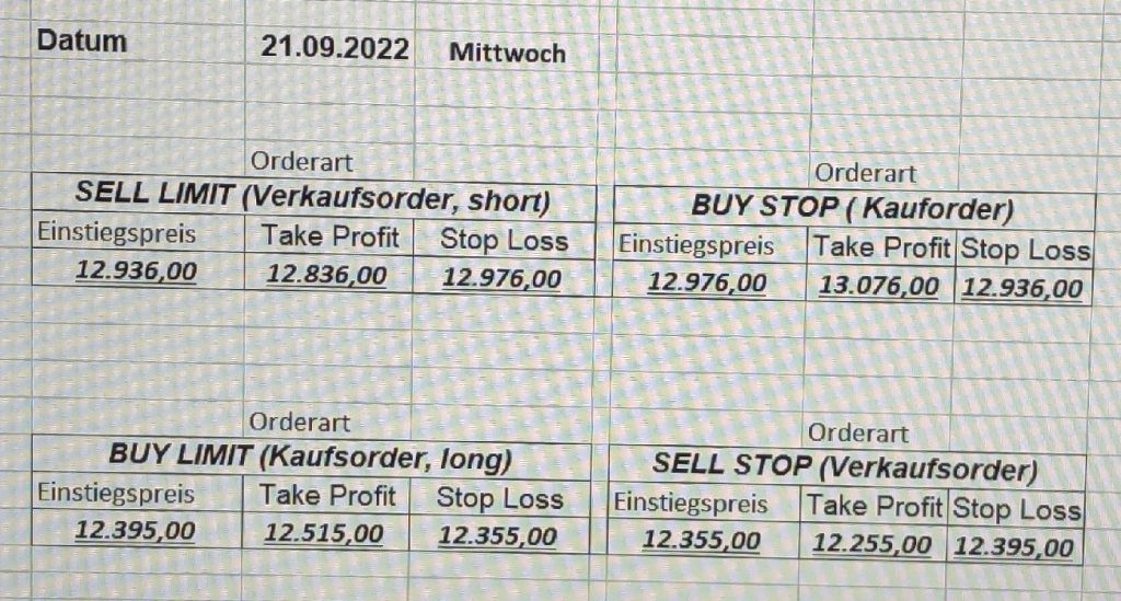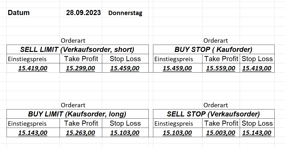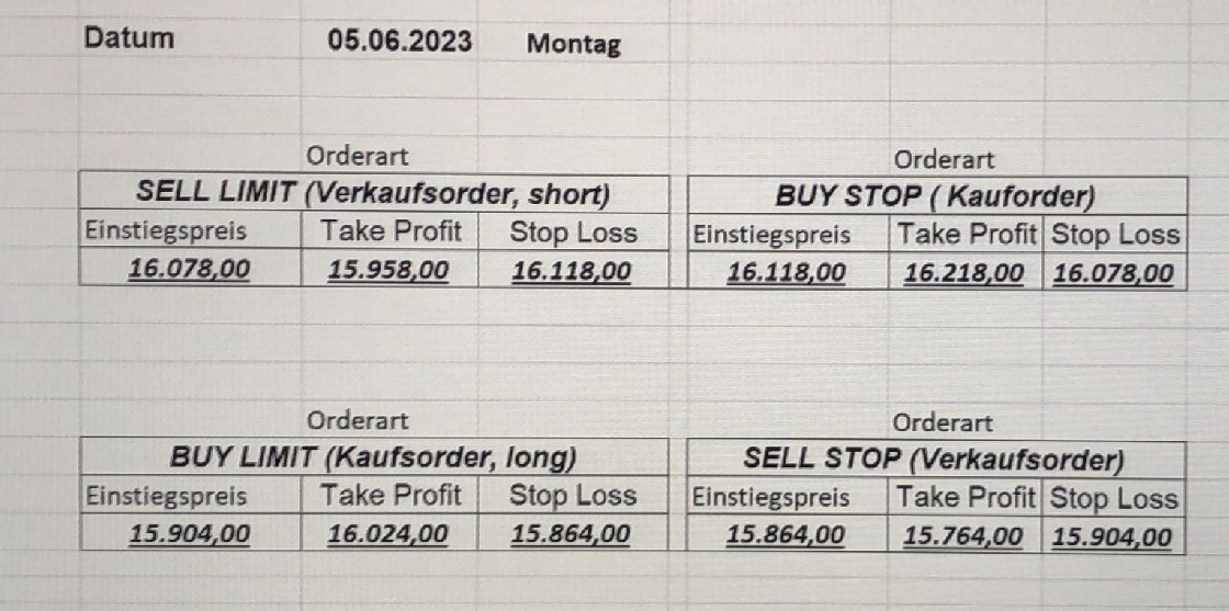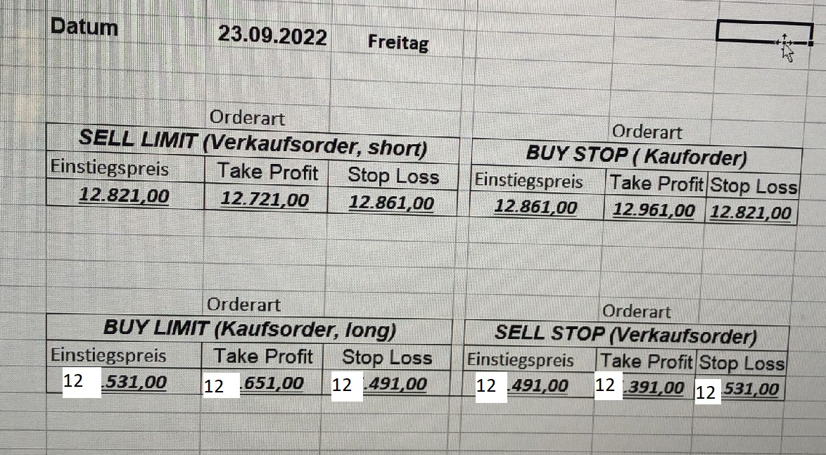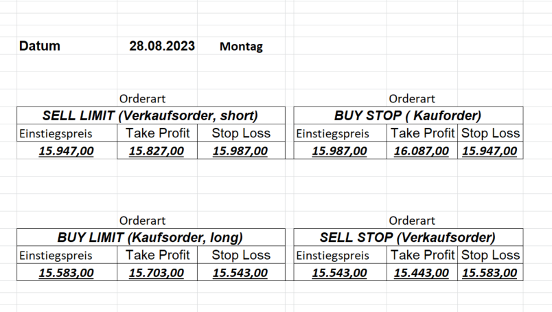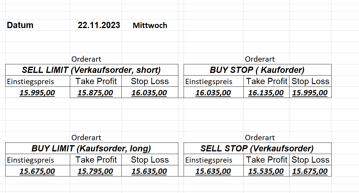 22.9.2023 Platzieren Sie die  Order bis 9:00 Löschen Sie bitte offene Order und Positionen um 21:45 ! Zur Frage der Punktgröße: Beispielrechnung: Bitte immer kurz auf den am weitest entfernten Stopp schauen. Diese Punktzahl sollte nicht mehr als 0,5% bis 1% des Kapitals ausmachen. 21.9.2023 Platzieren Sie die  Order bis 9:00 Löschen Sie bitte offene Order und Positionen um 21:45 ! Zur Frage der Punktgröße: Beispielrechnung: Bitte immer kurz auf den am weitest entfernten Stopp schauen. Diese Punktzahl sollte nicht mehr als 0,5% bis 1% des Kapitals ausmachen. 20.9.2023 Platzieren Sie die  Order bis 9:00 Löschen Sie bitte offene Order und Positionen um 21:45 ! Zur Frage der Punktgröße: Beispielrechnung: Bitte immer kurz auf den am weitest entfernten Stopp schauen. Diese Punktzahl sollte nicht mehr als 0,5% bis 1% des Kapitals ausmachen. 19.9.2023 Platzieren Sie die  Order bis 9:00 Löschen Sie bitte offene Order und Positionen um 21:45 ! Zur Frage der Punktgröße: Beispielrechnung: Bitte immer kurz auf den am weitest entfernten Stopp schauen. Diese Punktzahl sollte nicht mehr als 0,5% bis 1% des Kapitals ausmachen. So langsam kann ich wieder „kriechen“. Corona ist wirklich anstrengend. Zum FDAX: Wir haben ein Ergebnis: Es wird der „Kleine“ mit einem Euro pro Punkt. Wenn es weiter mit der Genesung vorangeht, werden wir am kommenden Montag endlich starten.  Achtung: Beim Buy Limit und beim Stopp Sell bitte die 16 durch 15 ersetzen. Also Buy Limit 15451 /15571/15411 Stopp Sell 15411/ 15311/ 15451 18.9.2023 Platzieren Sie die  Order bis 9:00 Löschen Sie bitte offene Order und Positionen um 21:45 ! Zur Frage der Punktgröße: Beispielrechnung: Bitte immer kurz auf den am weitest entfernten Stopp schauen. Diese Punktzahl sollte nicht mehr als 0,5% bis 1% des Kapitals ausmachen. 15.9.2023 Platzieren Sie die  Order bis 9:00 Löschen Sie bitte offene Order und Positionen um 21:45 ! Zur Frage der Punktgröße: Beispielrechnung: Bitte immer kurz auf den am weitest entfernten Stopp schauen. Diese Punktzahl sollte nicht mehr als 0,5% bis 1% des Kapitals ausmachen. 14.9.2023 Platzieren Sie die  Order bis 9:00 Löschen Sie bitte offene Order und Positionen um 21:45 ! Zur Frage der Punktgröße: Beispielrechnung: Bitte immer kurz auf den am weitest entfernten Stopp schauen. Diese Punktzahl sollte nicht mehr als 0,5% bis 1% des Kapitals ausmachen. 13.9.2023 Heute „spuckte“ das System keine tragfähigen Signale aus. Morgen geht es normal weiter!  12.9.2023