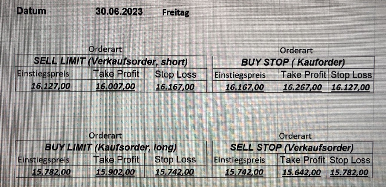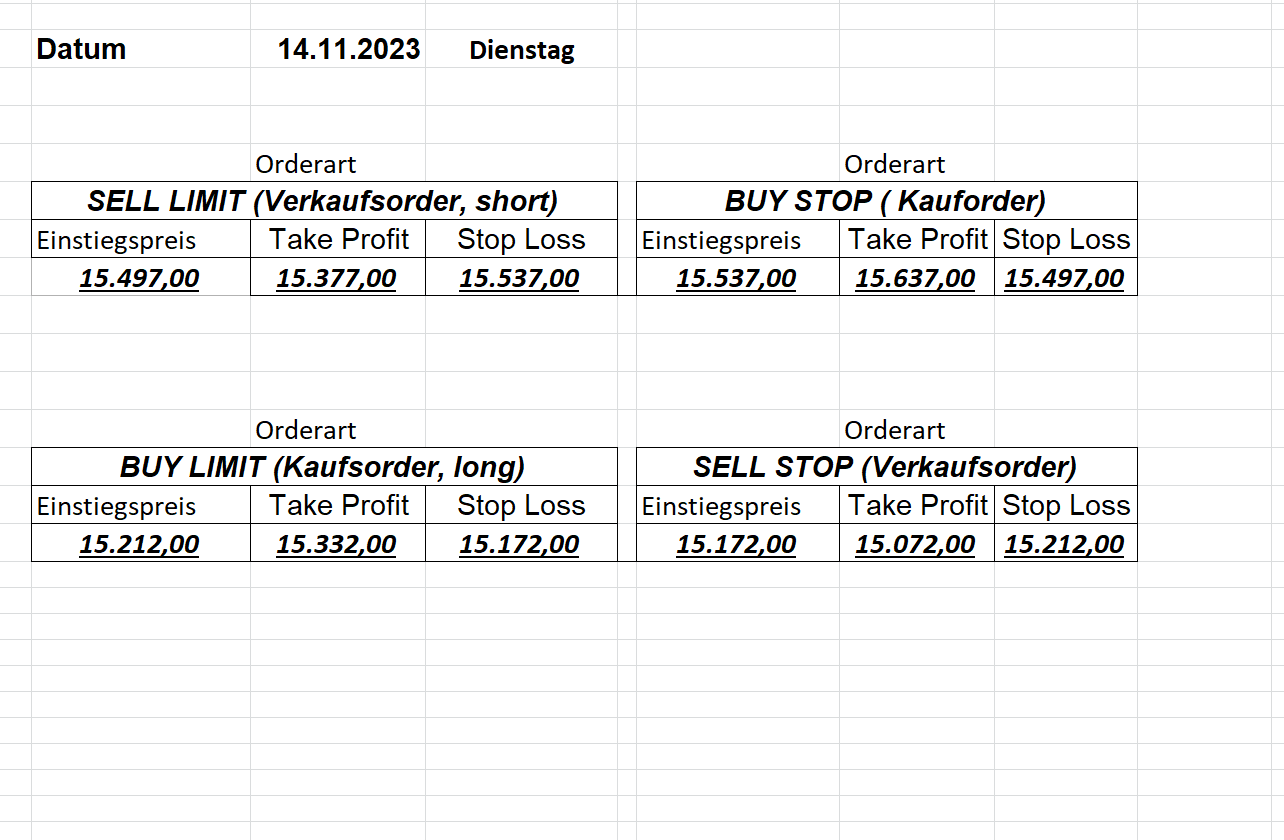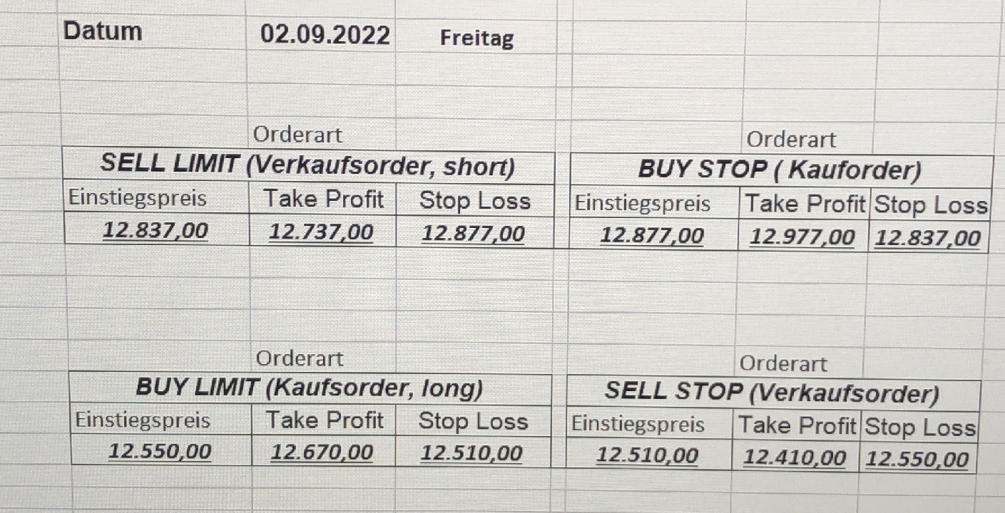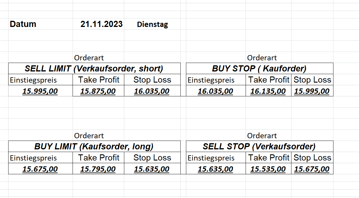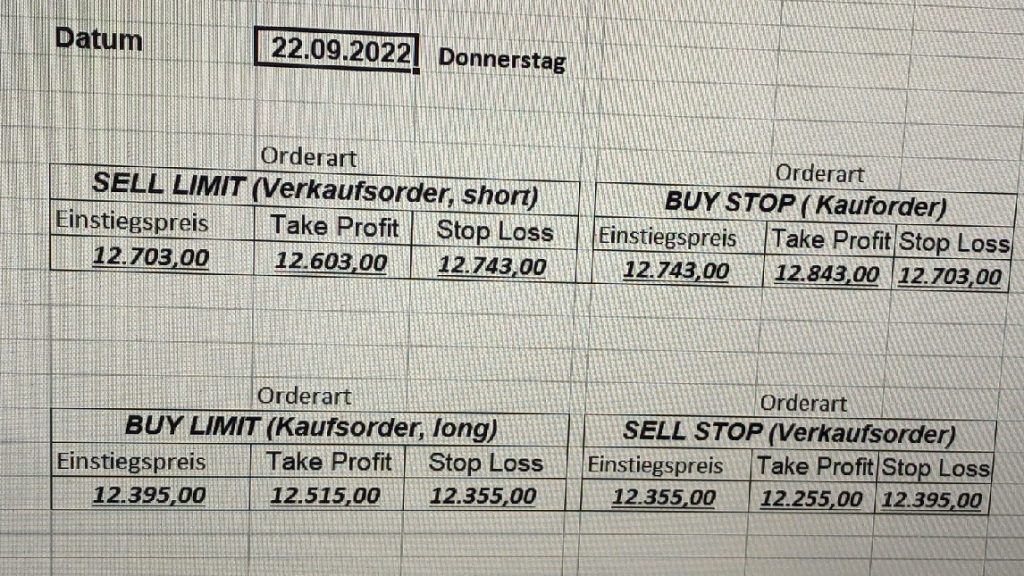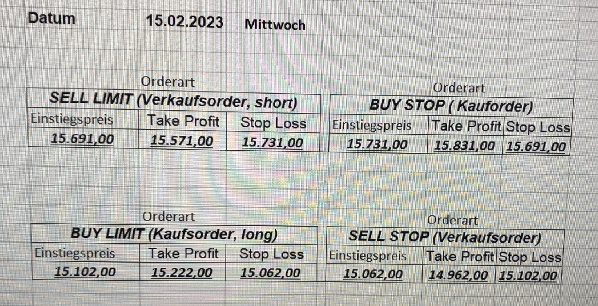 22.9.2023 Platzieren Sie die  Order bis 9:00 Löschen Sie bitte offene Order und Positionen um 21:45 ! Zur Frage der Punktgröße: Beispielrechnung: Bitte immer kurz auf den am weitest entfernten Stopp schauen. Diese Punktzahl sollte nicht mehr als 0,5% bis 1% des Kapitals ausmachen. 21.9.2023 Platzieren Sie die  Order bis 9:00 Löschen Sie bitte offene Order und Positionen um 21:45 ! Zur Frage der Punktgröße: Beispielrechnung: Bitte immer kurz auf den am weitest entfernten Stopp schauen. Diese Punktzahl sollte nicht mehr als 0,5% bis 1% des Kapitals ausmachen. 20.9.2023 Platzieren Sie die  Order bis 9:00 Löschen Sie bitte offene Order und Positionen um 21:45 ! Zur Frage der Punktgröße: Beispielrechnung: Bitte immer kurz auf den am weitest entfernten Stopp schauen. Diese Punktzahl sollte nicht mehr als 0,5% bis 1% des Kapitals ausmachen. 19.9.2023 Platzieren Sie die  Order bis 9:00 Löschen Sie bitte offene Order und Positionen um 21:45 ! Zur Frage der Punktgröße: Beispielrechnung: Bitte immer kurz auf den am weitest entfernten Stopp schauen. Diese Punktzahl sollte nicht mehr als 0,5% bis 1% des Kapitals ausmachen. So langsam kann ich wieder „kriechen“. Corona ist wirklich anstrengend. Zum FDAX: Wir haben ein Ergebnis: Es wird der „Kleine“ mit einem Euro pro Punkt. Wenn es weiter mit der Genesung vorangeht, werden wir am kommenden Montag endlich starten.  Achtung: Beim Buy Limit und beim Stopp Sell bitte die 16 durch 15 ersetzen. Also Buy Limit 15451 /15571/15411 Stopp Sell 15411/ 15311/ 15451 18.9.2023 Platzieren Sie die  Order bis 9:00 Löschen Sie bitte offene Order und Positionen um 21:45 ! Zur Frage der Punktgröße: Beispielrechnung: Bitte immer kurz auf den am weitest entfernten Stopp schauen. Diese Punktzahl sollte nicht mehr als 0,5% bis 1% des Kapitals ausmachen. 15.9.2023 Platzieren Sie die  Order bis 9:00 Löschen Sie bitte offene Order und Positionen um 21:45 ! Zur Frage der Punktgröße: Beispielrechnung: Bitte immer kurz auf den am weitest entfernten Stopp schauen. Diese Punktzahl sollte nicht mehr als 0,5% bis 1% des Kapitals ausmachen. 14.9.2023 Platzieren Sie die  Order bis 9:00 Löschen Sie bitte offene Order und Positionen um 21:45 ! Zur Frage der Punktgröße: Beispielrechnung: Bitte immer kurz auf den am weitest entfernten Stopp schauen. Diese Punktzahl sollte nicht mehr als 0,5% bis 1% des Kapitals ausmachen. 13.9.2023 Heute „spuckte“ das System keine tragfähigen Signale aus. Morgen geht es normal weiter!  12.9.2023