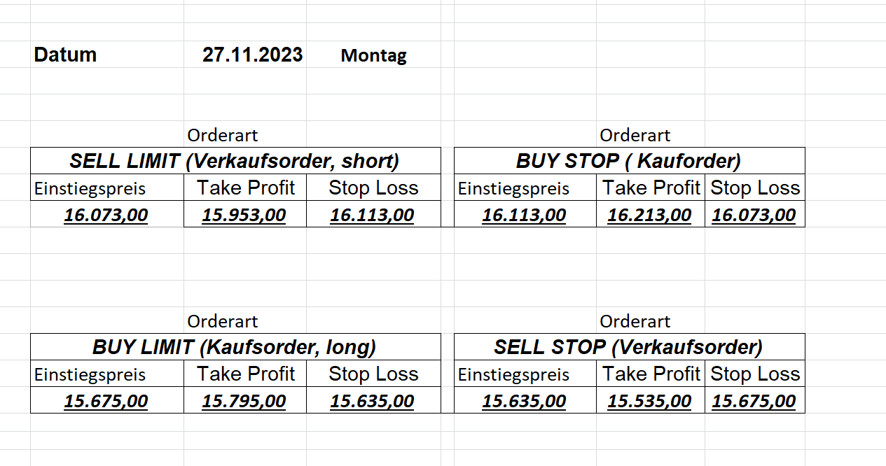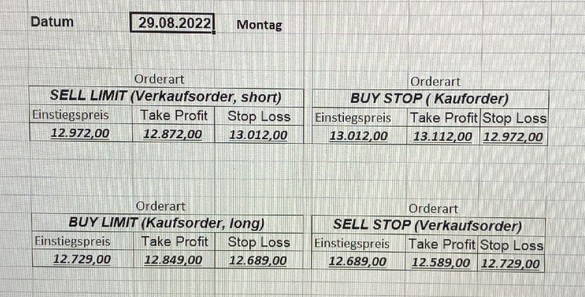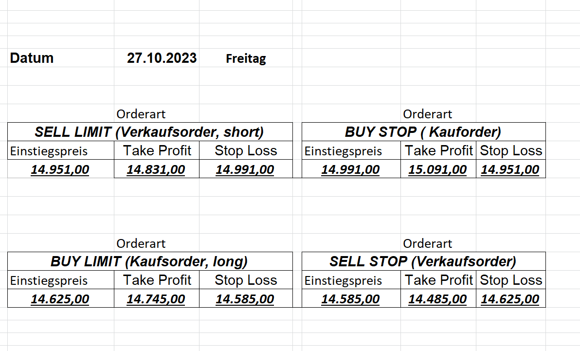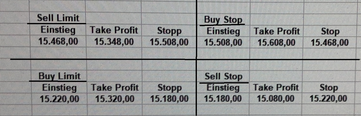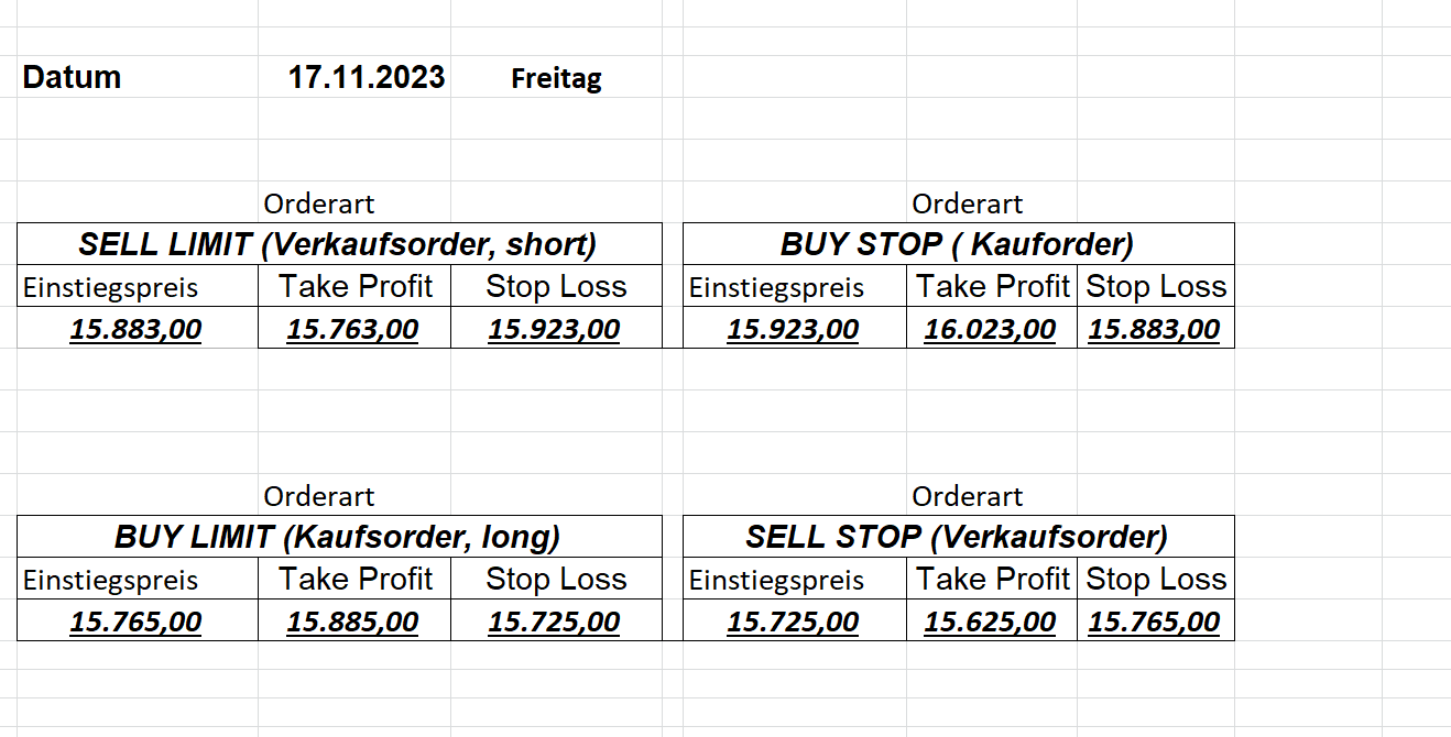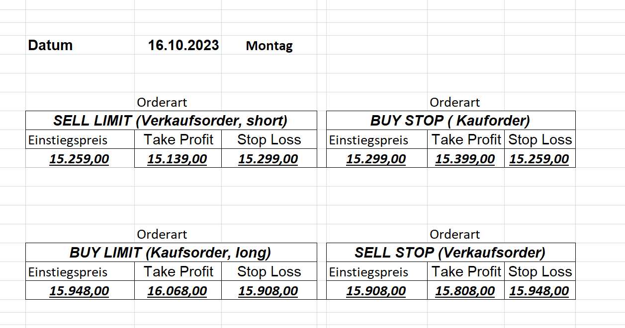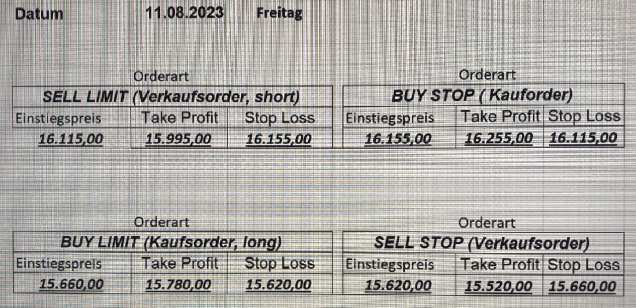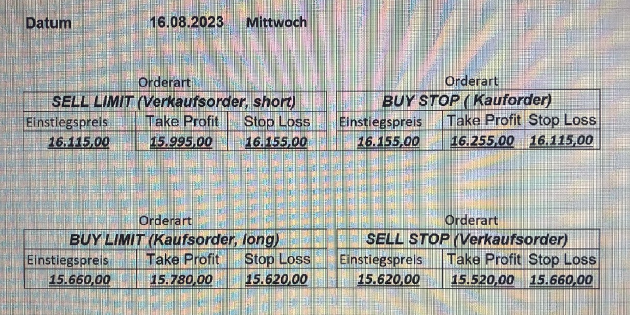 22.9.2023 Platzieren Sie die  Order bis 9:00 Löschen Sie bitte offene Order und Positionen um 21:45 ! Zur Frage der Punktgröße: Beispielrechnung: Bitte immer kurz auf den am weitest entfernten Stopp schauen. Diese Punktzahl sollte nicht mehr als 0,5% bis 1% des Kapitals ausmachen. 21.9.2023 Platzieren Sie die  Order bis 9:00 Löschen Sie bitte offene Order und Positionen um 21:45 ! Zur Frage der Punktgröße: Beispielrechnung: Bitte immer kurz auf den am weitest entfernten Stopp schauen. Diese Punktzahl sollte nicht mehr als 0,5% bis 1% des Kapitals ausmachen. 20.9.2023 Platzieren Sie die  Order bis 9:00 Löschen Sie bitte offene Order und Positionen um 21:45 ! Zur Frage der Punktgröße: Beispielrechnung: Bitte immer kurz auf den am weitest entfernten Stopp schauen. Diese Punktzahl sollte nicht mehr als 0,5% bis 1% des Kapitals ausmachen. 19.9.2023 Platzieren Sie die  Order bis 9:00 Löschen Sie bitte offene Order und Positionen um 21:45 ! Zur Frage der Punktgröße: Beispielrechnung: Bitte immer kurz auf den am weitest entfernten Stopp schauen. Diese Punktzahl sollte nicht mehr als 0,5% bis 1% des Kapitals ausmachen. So langsam kann ich wieder „kriechen“. Corona ist wirklich anstrengend. Zum FDAX: Wir haben ein Ergebnis: Es wird der „Kleine“ mit einem Euro pro Punkt. Wenn es weiter mit der Genesung vorangeht, werden wir am kommenden Montag endlich starten.  Achtung: Beim Buy Limit und beim Stopp Sell bitte die 16 durch 15 ersetzen. Also Buy Limit 15451 /15571/15411 Stopp Sell 15411/ 15311/ 15451 18.9.2023 Platzieren Sie die  Order bis 9:00 Löschen Sie bitte offene Order und Positionen um 21:45 ! Zur Frage der Punktgröße: Beispielrechnung: Bitte immer kurz auf den am weitest entfernten Stopp schauen. Diese Punktzahl sollte nicht mehr als 0,5% bis 1% des Kapitals ausmachen. 15.9.2023 Platzieren Sie die  Order bis 9:00 Löschen Sie bitte offene Order und Positionen um 21:45 ! Zur Frage der Punktgröße: Beispielrechnung: Bitte immer kurz auf den am weitest entfernten Stopp schauen. Diese Punktzahl sollte nicht mehr als 0,5% bis 1% des Kapitals ausmachen. 14.9.2023 Platzieren Sie die  Order bis 9:00 Löschen Sie bitte offene Order und Positionen um 21:45 ! Zur Frage der Punktgröße: Beispielrechnung: Bitte immer kurz auf den am weitest entfernten Stopp schauen. Diese Punktzahl sollte nicht mehr als 0,5% bis 1% des Kapitals ausmachen. 13.9.2023 Heute „spuckte“ das System keine tragfähigen Signale aus. Morgen geht es normal weiter!  12.9.2023