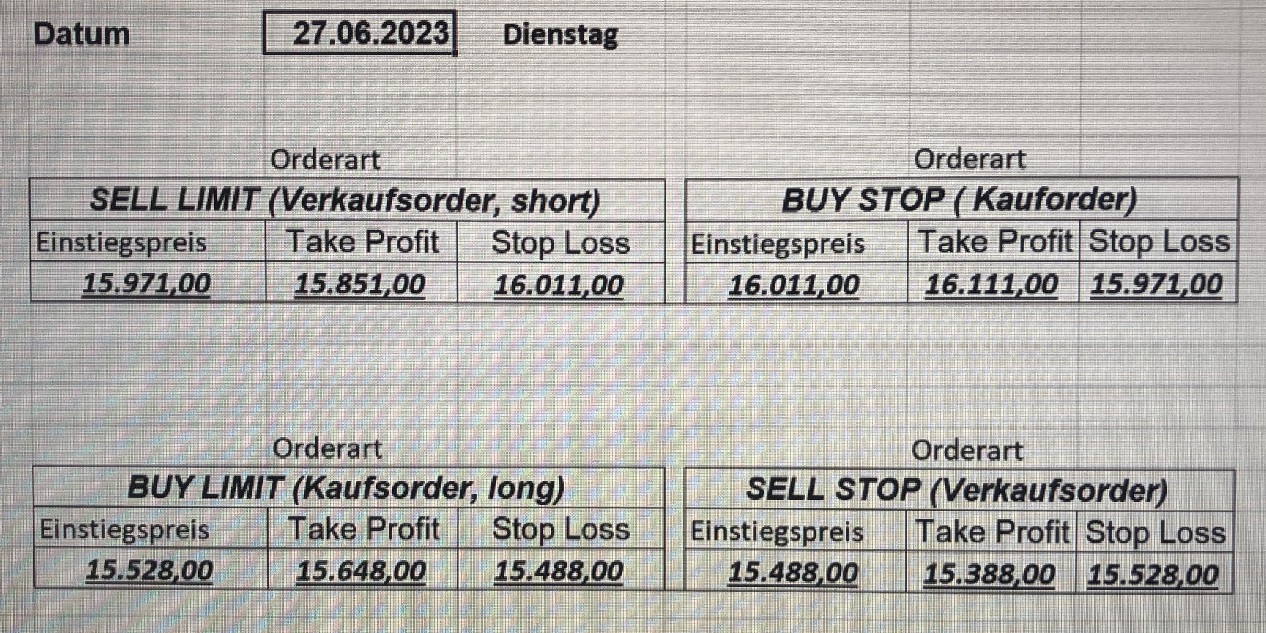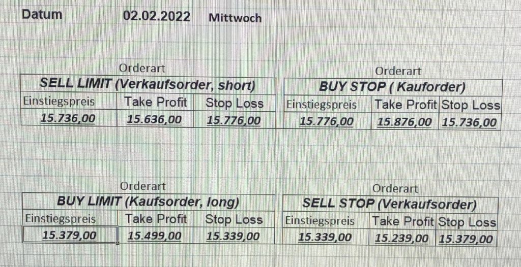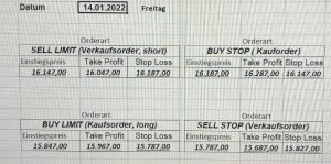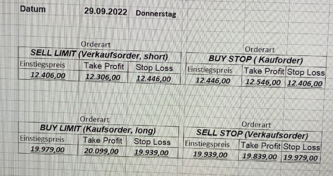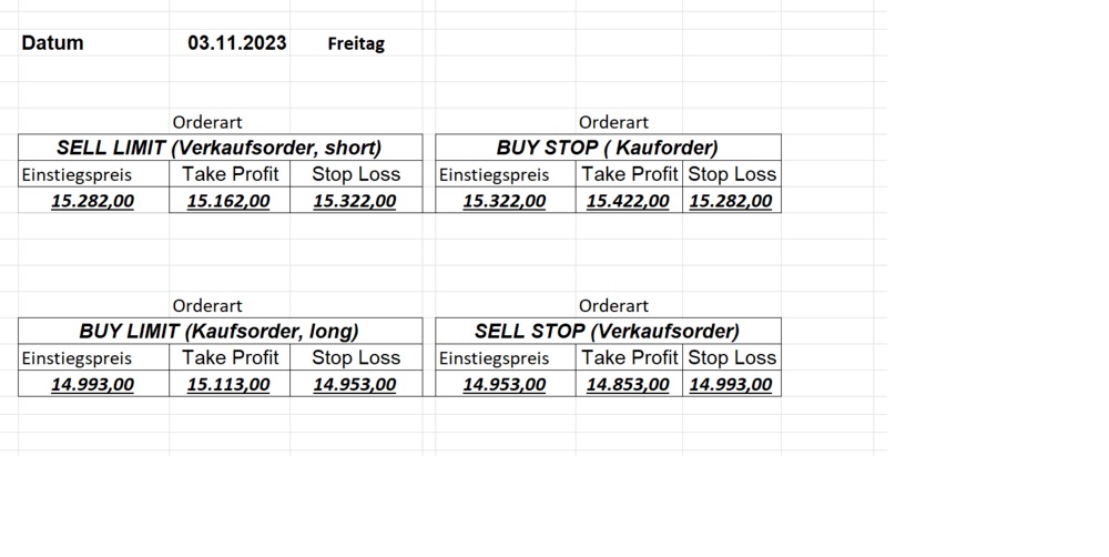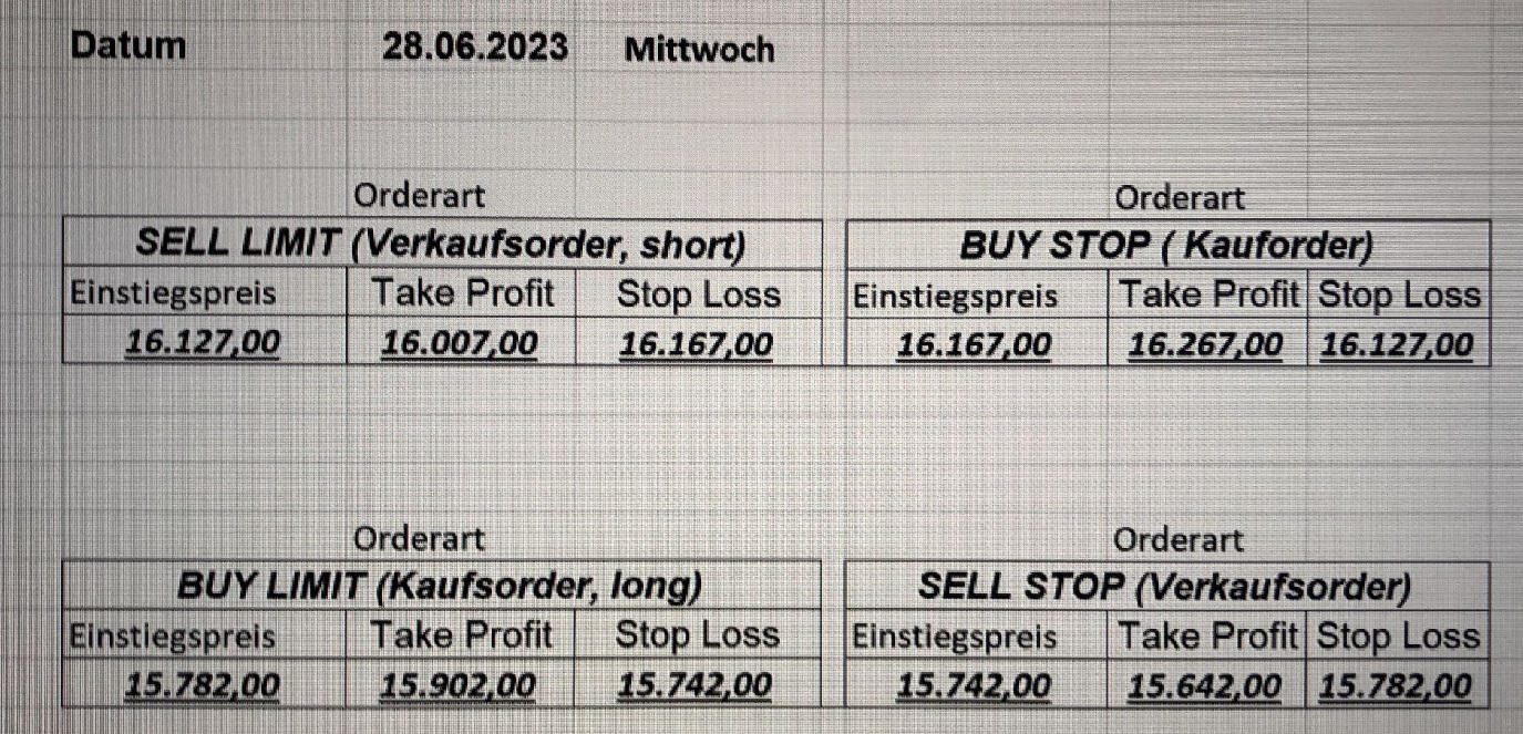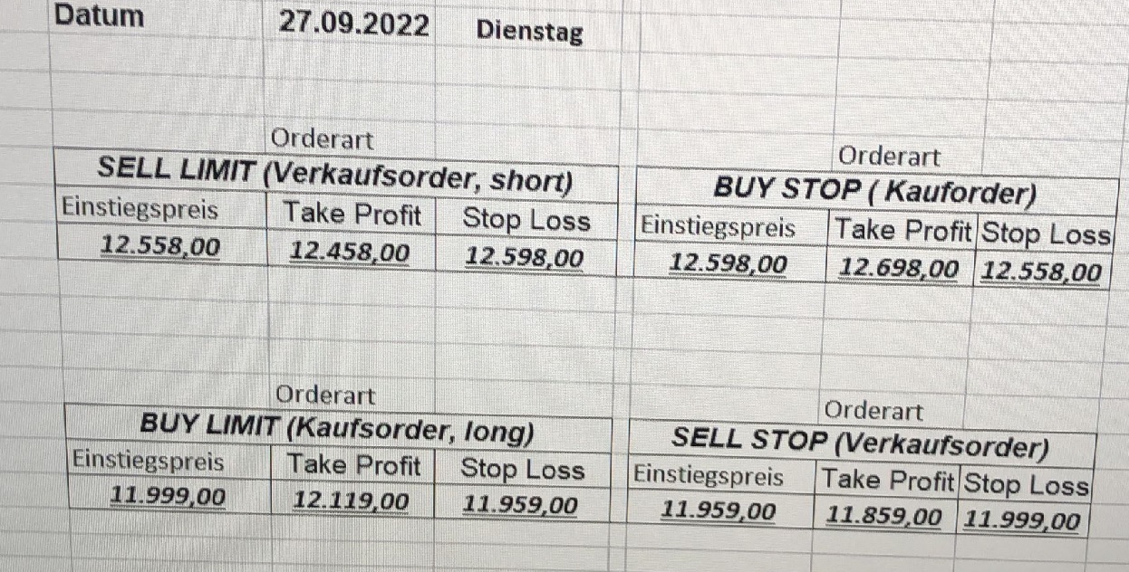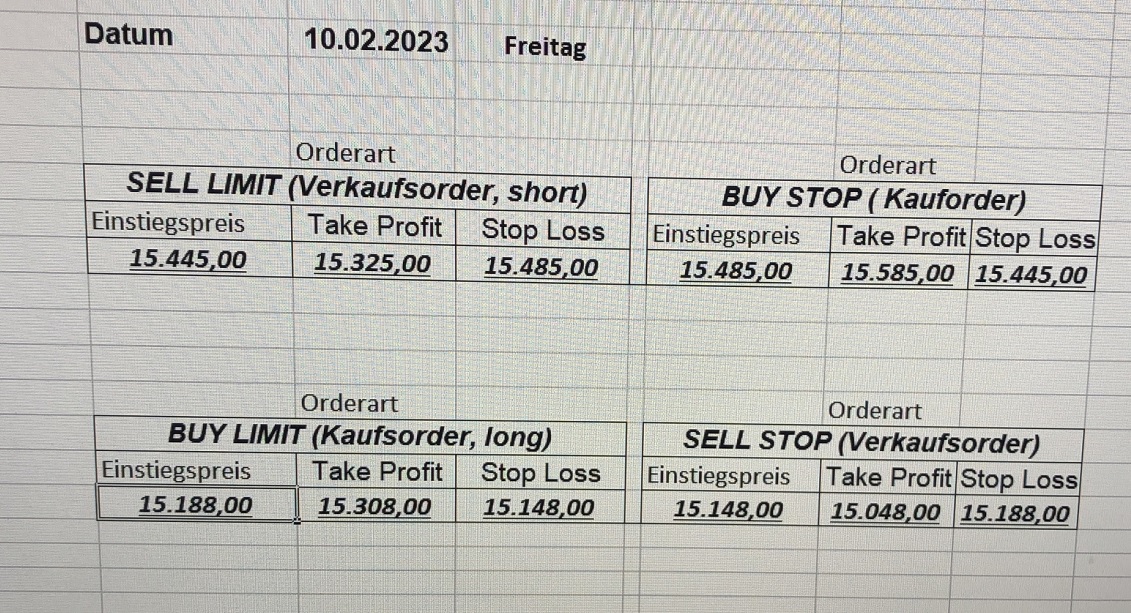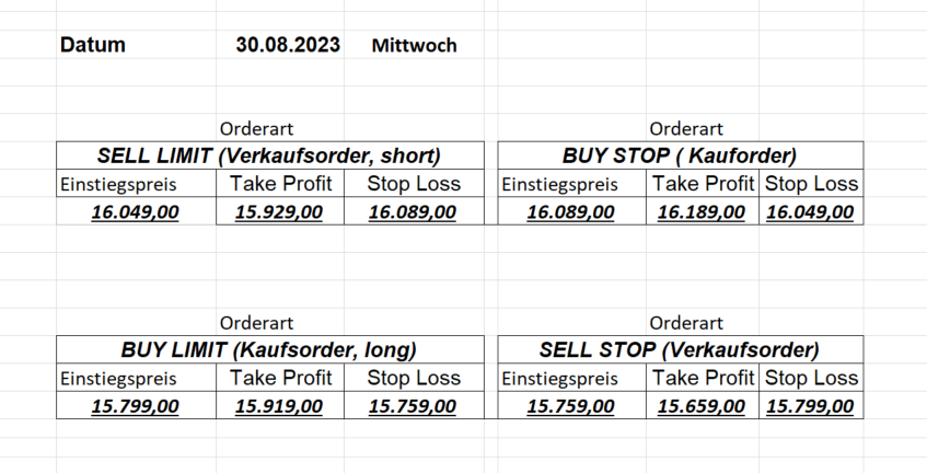 22.9.2023 Platzieren Sie die  Order bis 9:00 Löschen Sie bitte offene Order und Positionen um 21:45 ! Zur Frage der Punktgröße: Beispielrechnung: Bitte immer kurz auf den am weitest entfernten Stopp schauen. Diese Punktzahl sollte nicht mehr als 0,5% bis 1% des Kapitals ausmachen. 21.9.2023 Platzieren Sie die  Order bis 9:00 Löschen Sie bitte offene Order und Positionen um 21:45 ! Zur Frage der Punktgröße: Beispielrechnung: Bitte immer kurz auf den am weitest entfernten Stopp schauen. Diese Punktzahl sollte nicht mehr als 0,5% bis 1% des Kapitals ausmachen. 20.9.2023 Platzieren Sie die  Order bis 9:00 Löschen Sie bitte offene Order und Positionen um 21:45 ! Zur Frage der Punktgröße: Beispielrechnung: Bitte immer kurz auf den am weitest entfernten Stopp schauen. Diese Punktzahl sollte nicht mehr als 0,5% bis 1% des Kapitals ausmachen. 19.9.2023 Platzieren Sie die  Order bis 9:00 Löschen Sie bitte offene Order und Positionen um 21:45 ! Zur Frage der Punktgröße: Beispielrechnung: Bitte immer kurz auf den am weitest entfernten Stopp schauen. Diese Punktzahl sollte nicht mehr als 0,5% bis 1% des Kapitals ausmachen. So langsam kann ich wieder „kriechen“. Corona ist wirklich anstrengend. Zum FDAX: Wir haben ein Ergebnis: Es wird der „Kleine“ mit einem Euro pro Punkt. Wenn es weiter mit der Genesung vorangeht, werden wir am kommenden Montag endlich starten.  Achtung: Beim Buy Limit und beim Stopp Sell bitte die 16 durch 15 ersetzen. Also Buy Limit 15451 /15571/15411 Stopp Sell 15411/ 15311/ 15451 18.9.2023 Platzieren Sie die  Order bis 9:00 Löschen Sie bitte offene Order und Positionen um 21:45 ! Zur Frage der Punktgröße: Beispielrechnung: Bitte immer kurz auf den am weitest entfernten Stopp schauen. Diese Punktzahl sollte nicht mehr als 0,5% bis 1% des Kapitals ausmachen. 15.9.2023 Platzieren Sie die  Order bis 9:00 Löschen Sie bitte offene Order und Positionen um 21:45 ! Zur Frage der Punktgröße: Beispielrechnung: Bitte immer kurz auf den am weitest entfernten Stopp schauen. Diese Punktzahl sollte nicht mehr als 0,5% bis 1% des Kapitals ausmachen. 14.9.2023 Platzieren Sie die  Order bis 9:00 Löschen Sie bitte offene Order und Positionen um 21:45 ! Zur Frage der Punktgröße: Beispielrechnung: Bitte immer kurz auf den am weitest entfernten Stopp schauen. Diese Punktzahl sollte nicht mehr als 0,5% bis 1% des Kapitals ausmachen. 13.9.2023 Heute „spuckte“ das System keine tragfähigen Signale aus. Morgen geht es normal weiter!  12.9.2023