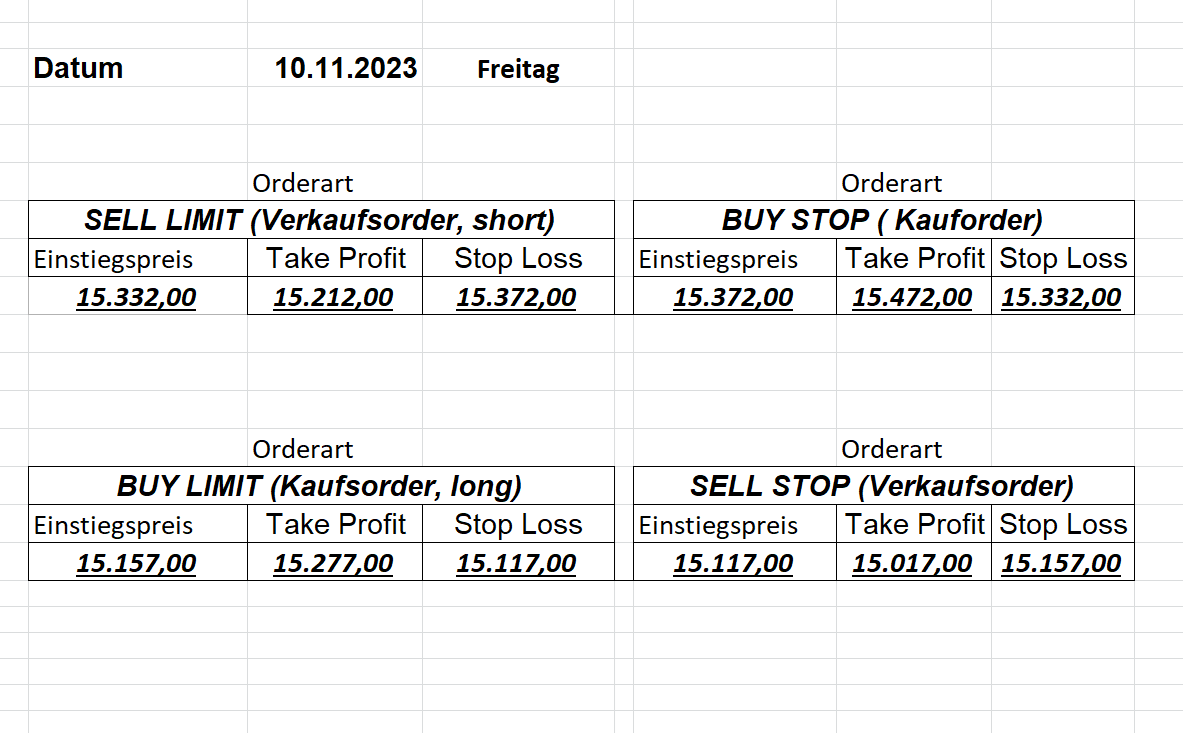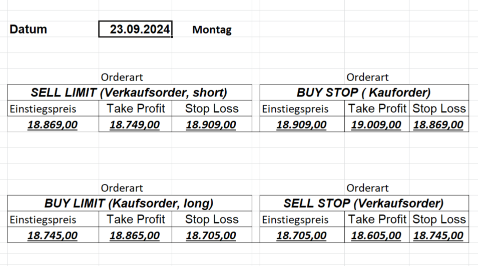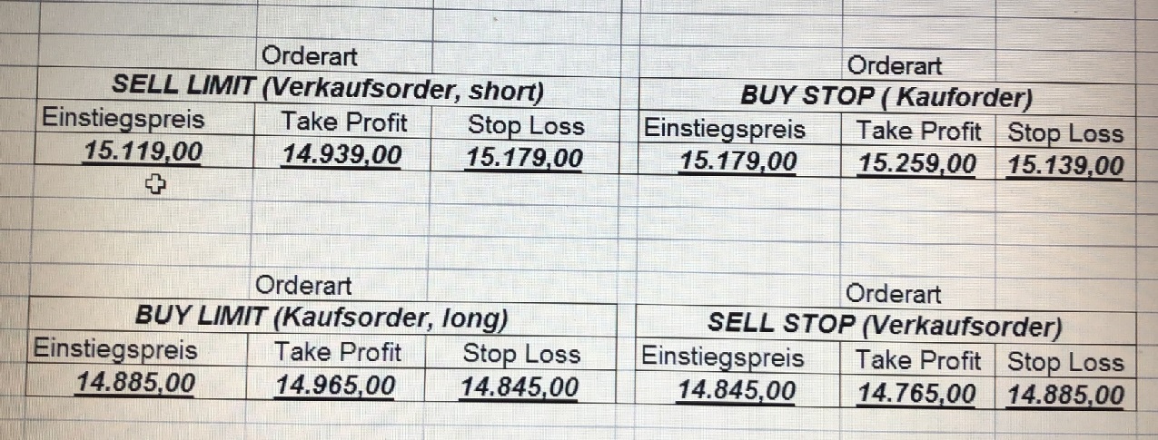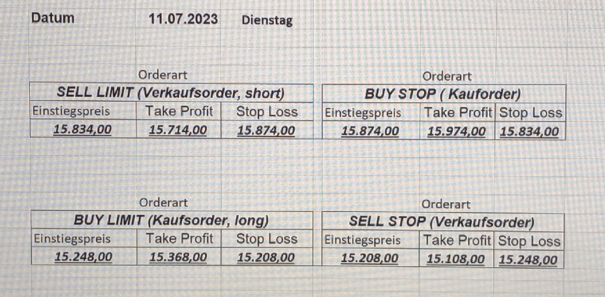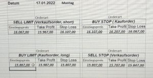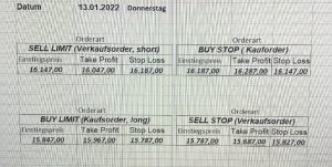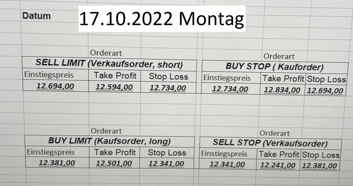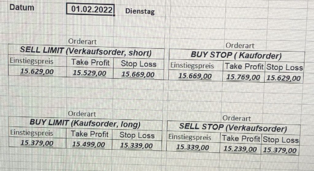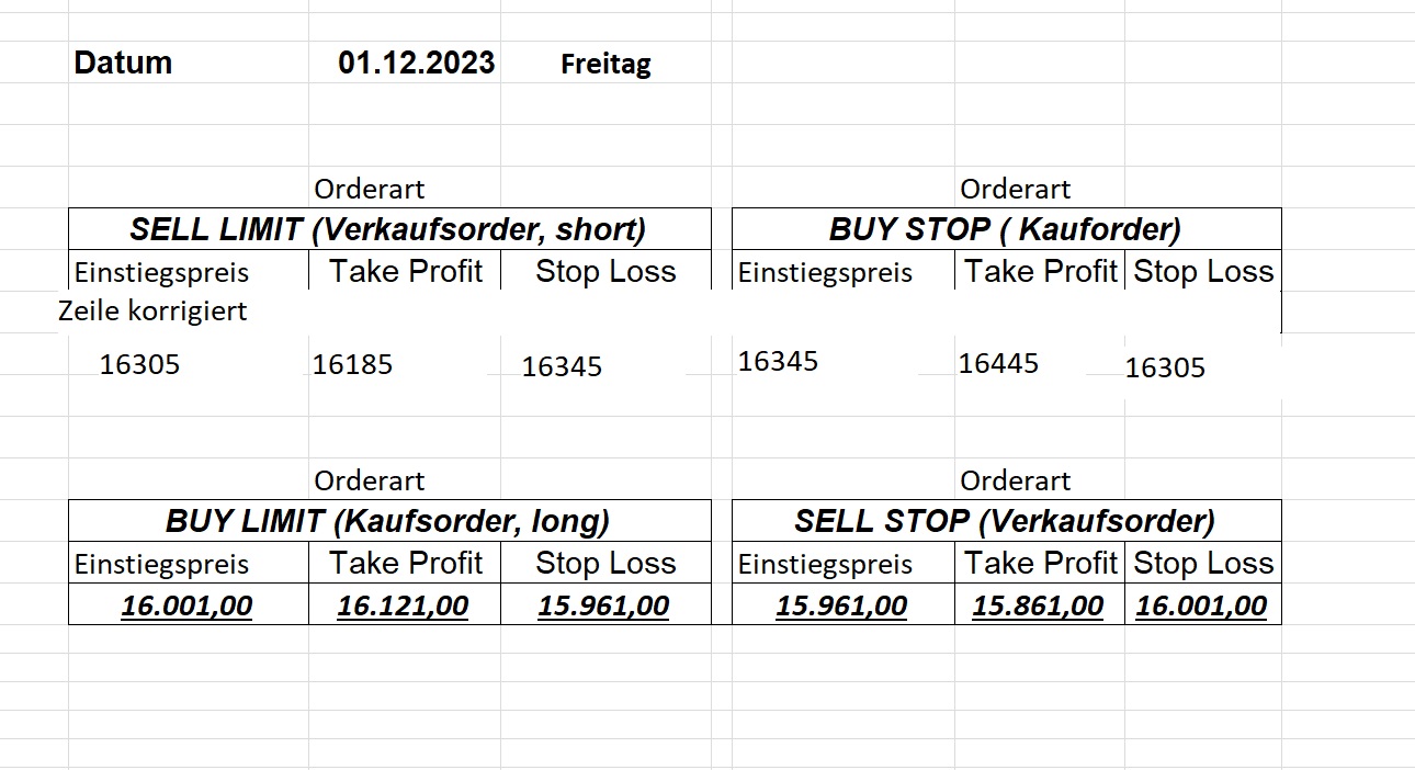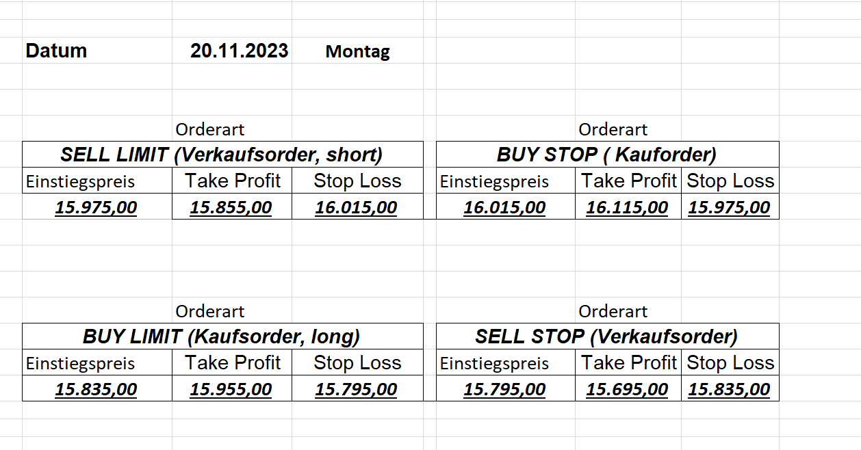 22.9.2023 Platzieren Sie die  Order bis 9:00 Löschen Sie bitte offene Order und Positionen um 21:45 ! Zur Frage der Punktgröße: Beispielrechnung: Bitte immer kurz auf den am weitest entfernten Stopp schauen. Diese Punktzahl sollte nicht mehr als 0,5% bis 1% des Kapitals ausmachen. 21.9.2023 Platzieren Sie die  Order bis 9:00 Löschen Sie bitte offene Order und Positionen um 21:45 ! Zur Frage der Punktgröße: Beispielrechnung: Bitte immer kurz auf den am weitest entfernten Stopp schauen. Diese Punktzahl sollte nicht mehr als 0,5% bis 1% des Kapitals ausmachen. 20.9.2023 Platzieren Sie die  Order bis 9:00 Löschen Sie bitte offene Order und Positionen um 21:45 ! Zur Frage der Punktgröße: Beispielrechnung: Bitte immer kurz auf den am weitest entfernten Stopp schauen. Diese Punktzahl sollte nicht mehr als 0,5% bis 1% des Kapitals ausmachen. 19.9.2023 Platzieren Sie die  Order bis 9:00 Löschen Sie bitte offene Order und Positionen um 21:45 ! Zur Frage der Punktgröße: Beispielrechnung: Bitte immer kurz auf den am weitest entfernten Stopp schauen. Diese Punktzahl sollte nicht mehr als 0,5% bis 1% des Kapitals ausmachen. So langsam kann ich wieder „kriechen“. Corona ist wirklich anstrengend. Zum FDAX: Wir haben ein Ergebnis: Es wird der „Kleine“ mit einem Euro pro Punkt. Wenn es weiter mit der Genesung vorangeht, werden wir am kommenden Montag endlich starten.  Achtung: Beim Buy Limit und beim Stopp Sell bitte die 16 durch 15 ersetzen. Also Buy Limit 15451 /15571/15411 Stopp Sell 15411/ 15311/ 15451 18.9.2023 Platzieren Sie die  Order bis 9:00 Löschen Sie bitte offene Order und Positionen um 21:45 ! Zur Frage der Punktgröße: Beispielrechnung: Bitte immer kurz auf den am weitest entfernten Stopp schauen. Diese Punktzahl sollte nicht mehr als 0,5% bis 1% des Kapitals ausmachen. 15.9.2023 Platzieren Sie die  Order bis 9:00 Löschen Sie bitte offene Order und Positionen um 21:45 ! Zur Frage der Punktgröße: Beispielrechnung: Bitte immer kurz auf den am weitest entfernten Stopp schauen. Diese Punktzahl sollte nicht mehr als 0,5% bis 1% des Kapitals ausmachen. 14.9.2023 Platzieren Sie die  Order bis 9:00 Löschen Sie bitte offene Order und Positionen um 21:45 ! Zur Frage der Punktgröße: Beispielrechnung: Bitte immer kurz auf den am weitest entfernten Stopp schauen. Diese Punktzahl sollte nicht mehr als 0,5% bis 1% des Kapitals ausmachen. 13.9.2023 Heute „spuckte“ das System keine tragfähigen Signale aus. Morgen geht es normal weiter!  12.9.2023