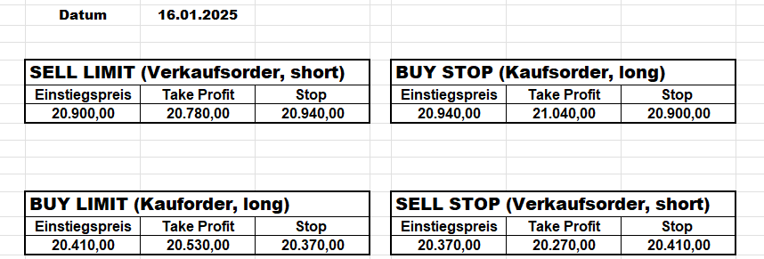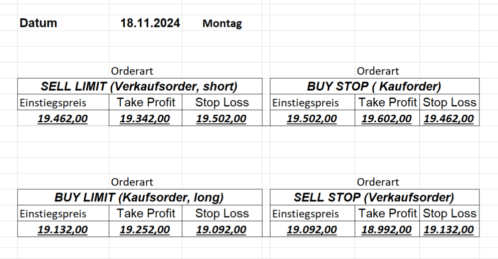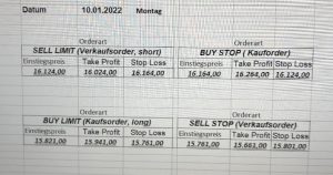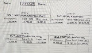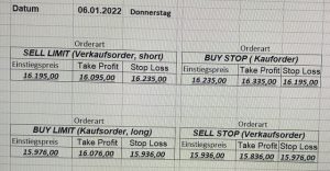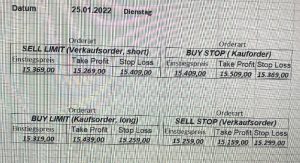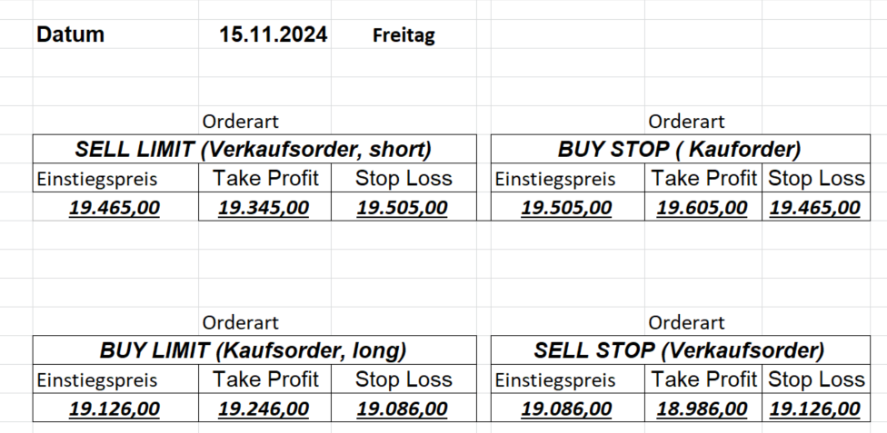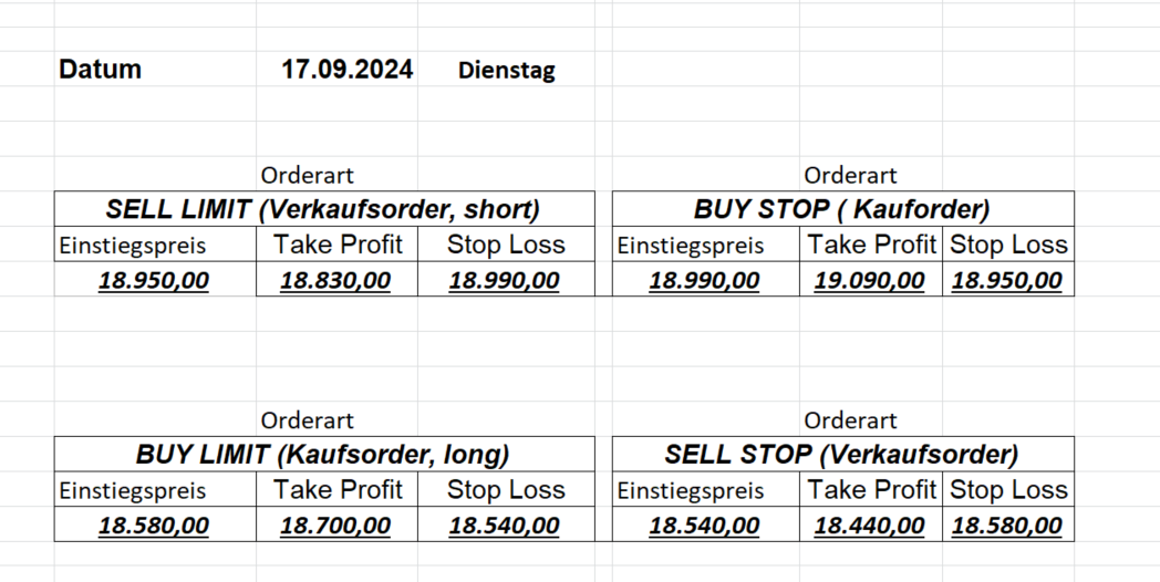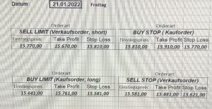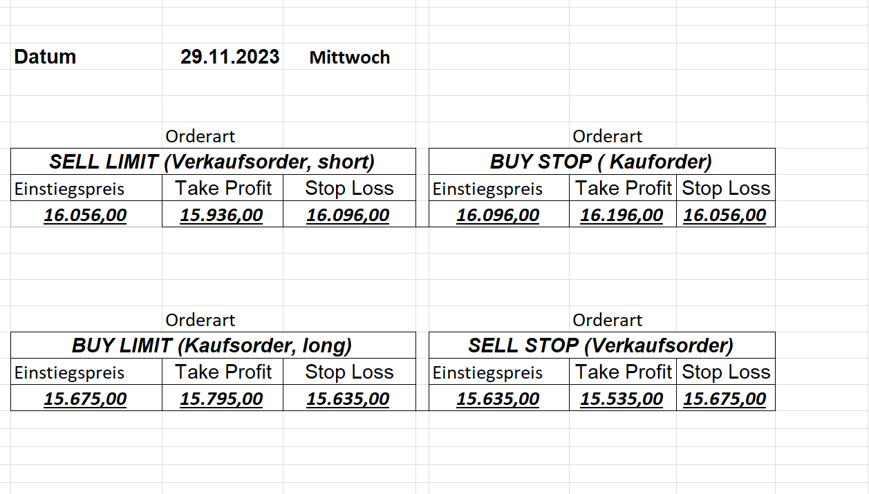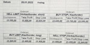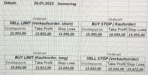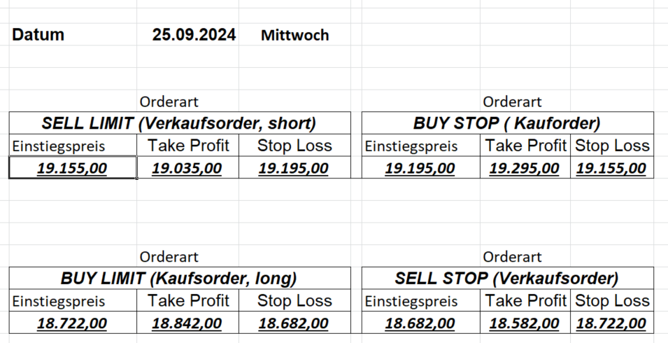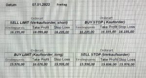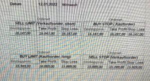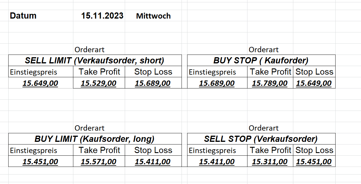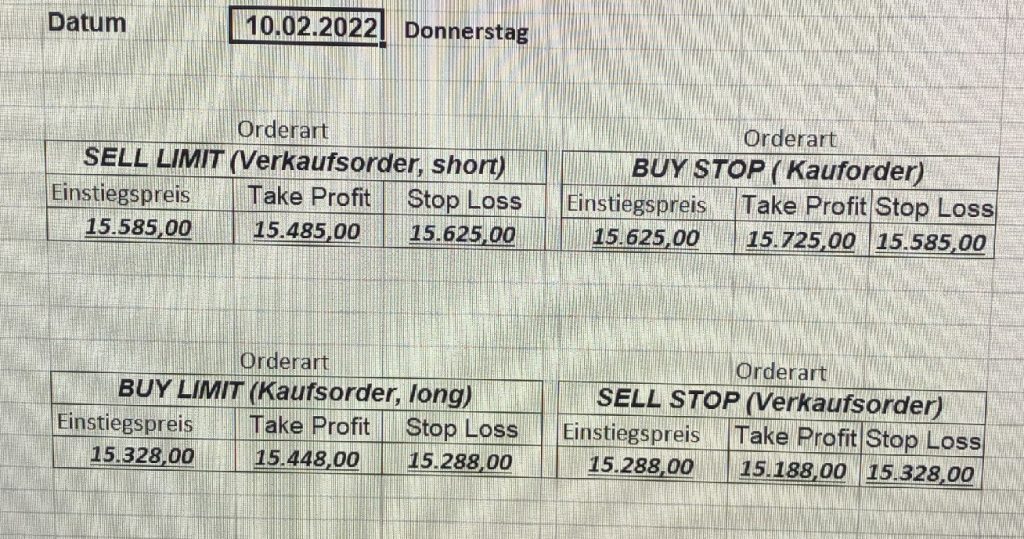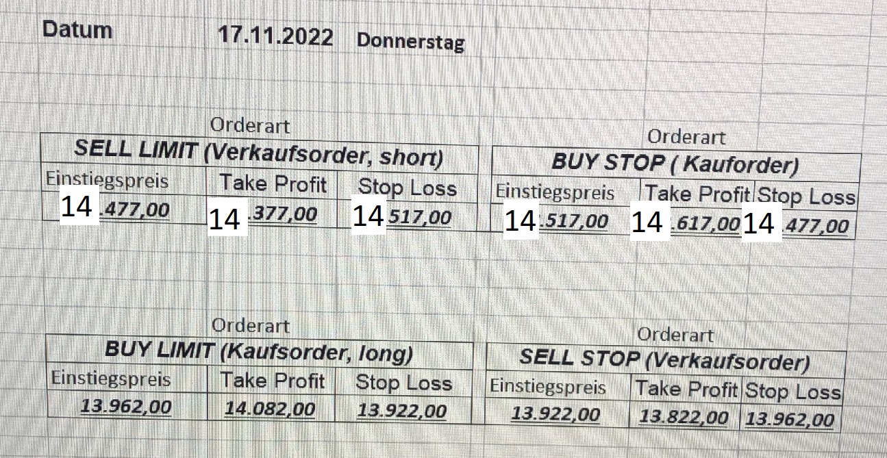 22.9.2023 Platzieren Sie die  Order bis 9:00 Löschen Sie bitte offene Order und Positionen um 21:45 ! Zur Frage der Punktgröße: Beispielrechnung: Bitte immer kurz auf den am weitest entfernten Stopp schauen. Diese Punktzahl sollte nicht mehr als 0,5% bis 1% des Kapitals ausmachen. 21.9.2023 Platzieren Sie die  Order bis 9:00 Löschen Sie bitte offene Order und Positionen um 21:45 ! Zur Frage der Punktgröße: Beispielrechnung: Bitte immer kurz auf den am weitest entfernten Stopp schauen. Diese Punktzahl sollte nicht mehr als 0,5% bis 1% des Kapitals ausmachen. 20.9.2023 Platzieren Sie die  Order bis 9:00 Löschen Sie bitte offene Order und Positionen um 21:45 ! Zur Frage der Punktgröße: Beispielrechnung: Bitte immer kurz auf den am weitest entfernten Stopp schauen. Diese Punktzahl sollte nicht mehr als 0,5% bis 1% des Kapitals ausmachen. 19.9.2023 Platzieren Sie die  Order bis 9:00 Löschen Sie bitte offene Order und Positionen um 21:45 ! Zur Frage der Punktgröße: Beispielrechnung: Bitte immer kurz auf den am weitest entfernten Stopp schauen. Diese Punktzahl sollte nicht mehr als 0,5% bis 1% des Kapitals ausmachen. So langsam kann ich wieder „kriechen“. Corona ist wirklich anstrengend. Zum FDAX: Wir haben ein Ergebnis: Es wird der „Kleine“ mit einem Euro pro Punkt. Wenn es weiter mit der Genesung vorangeht, werden wir am kommenden Montag endlich starten.  Achtung: Beim Buy Limit und beim Stopp Sell bitte die 16 durch 15 ersetzen. Also Buy Limit 15451 /15571/15411 Stopp Sell 15411/ 15311/ 15451 18.9.2023 Platzieren Sie die  Order bis 9:00 Löschen Sie bitte offene Order und Positionen um 21:45 ! Zur Frage der Punktgröße: Beispielrechnung: Bitte immer kurz auf den am weitest entfernten Stopp schauen. Diese Punktzahl sollte nicht mehr als 0,5% bis 1% des Kapitals ausmachen. 15.9.2023 Platzieren Sie die  Order bis 9:00 Löschen Sie bitte offene Order und Positionen um 21:45 ! Zur Frage der Punktgröße: Beispielrechnung: Bitte immer kurz auf den am weitest entfernten Stopp schauen. Diese Punktzahl sollte nicht mehr als 0,5% bis 1% des Kapitals ausmachen. 14.9.2023 Platzieren Sie die  Order bis 9:00 Löschen Sie bitte offene Order und Positionen um 21:45 ! Zur Frage der Punktgröße: Beispielrechnung: Bitte immer kurz auf den am weitest entfernten Stopp schauen. Diese Punktzahl sollte nicht mehr als 0,5% bis 1% des Kapitals ausmachen. 13.9.2023 Heute „spuckte“ das System keine tragfähigen Signale aus. Morgen geht es normal weiter!  12.9.2023