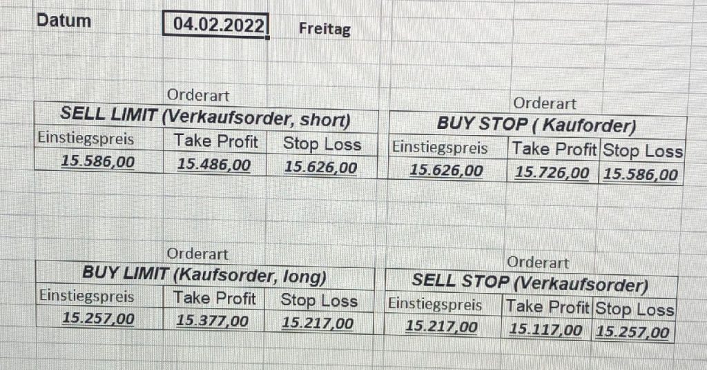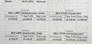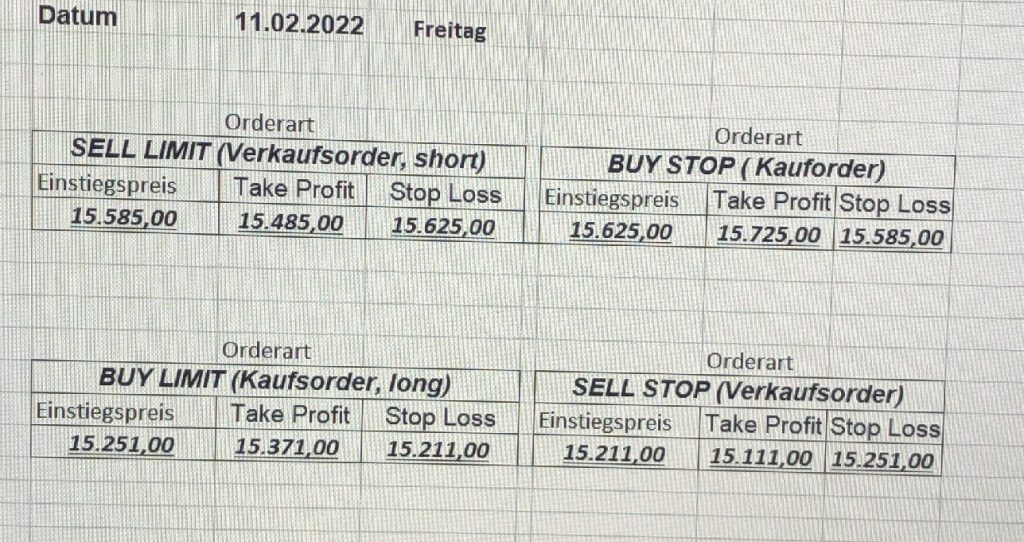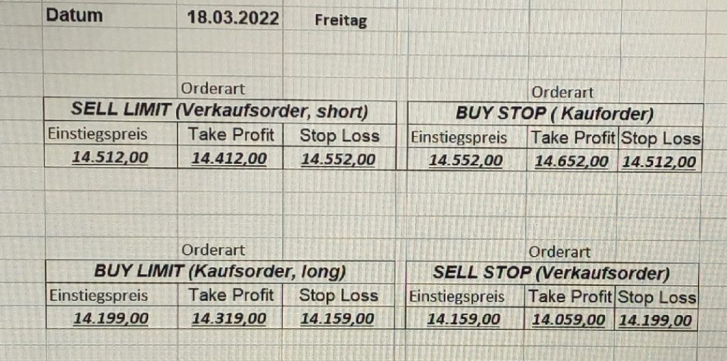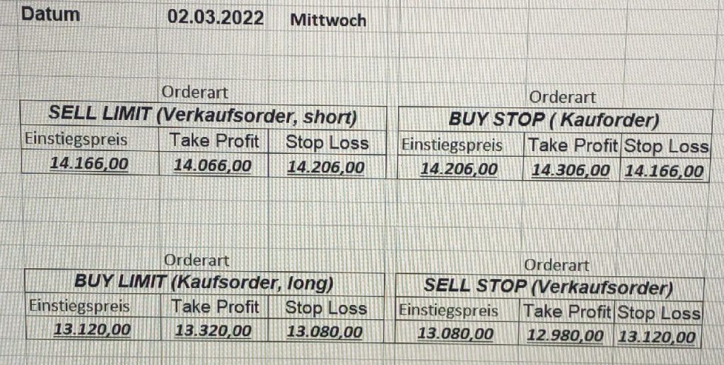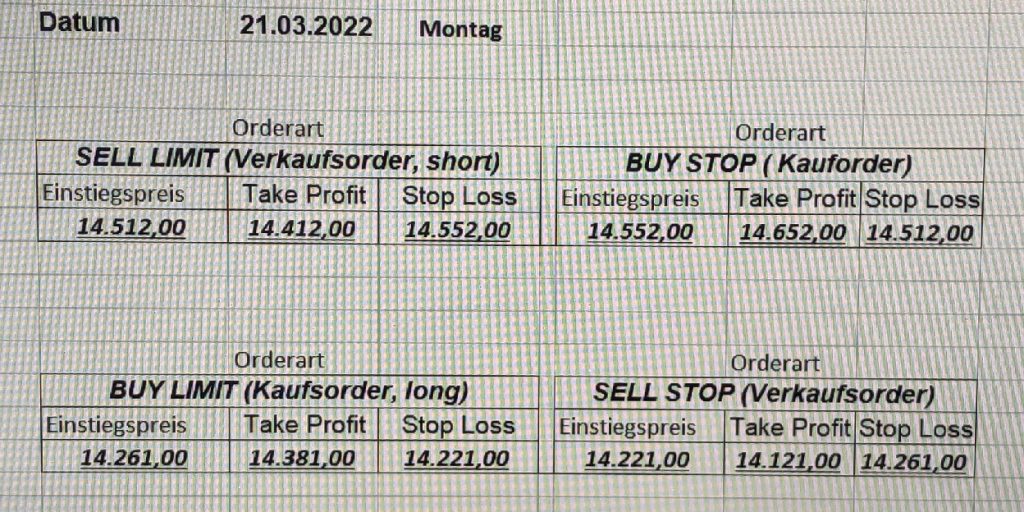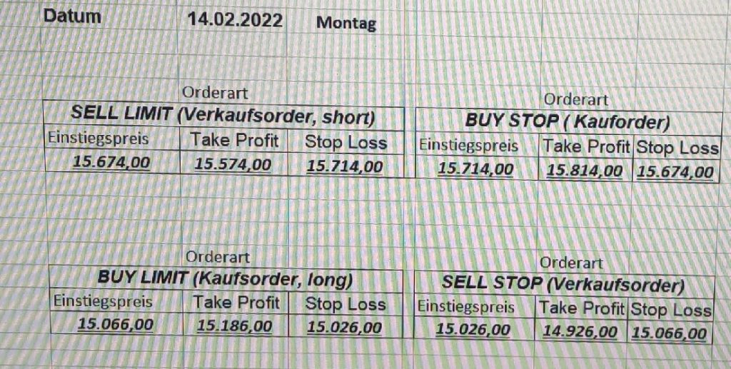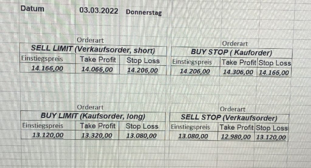 3.3.2022 Wir bleiben bei den Marken von gestern 2.3.2022: Achtung Wir legen uns bewusst an diesen Marken in den Markt. Wir brauchen Extrempunkte aufgrund der hohen Volatilität! Bitte platzieren Sie Ihre Order bis 9:00. Bitte wählen Sie Ihre Positionsgröße so, dass Sie bei einem Stopp nicht mehr als 0,5% bis 1% Ihres Depots riskieren!  1.3.2022:Russischer Konvoi auf dem Weg nach Kiew. Es wird volatil werden.  Wir planen einen Einstieg morgen, arbeiten gerade an den CRVs und Positionsgrößen, die wir verantworten können!  28.2.2022 Erneut sehen wir uns einer Eröffnung mit massivem Gap gegenüber. Das ist in der aktuellen Lage sicherlich nicht überraschend. Das Problem: Wir können aktuell keine Stopps setzen, die nur ansatzweise im Rahmen wären. Auch wenn es niemandem gefällt: Wir bleiben auch heute aus dem Markt!   25.2.2022 Wir werden mal am Montag, wenn das WE vorbei ist, „vorsichtig“ in den Markt gehen. Aktuell ist die Lage mehr als unübersichtlich. Denken Sie dran: Auch Handelsaussetzungen sind jederzeit möglich. Dann greifen auch die Stopps nicht mehr! 24.2.2022 Sollte klar sein, dass wir auch heute nicht in den Markt gehen! 23.2.2022 Auch heute bleiben wir noch aus dem Markt! Zu viel Volatilität! 22.2.2022 Aufgrund der aktuellen politischen Entwicklung in der Ukraine heute keine Signale! 21.2.2022 Bitte platzieren Sie Ihre Order bis 9:00. Bitte wählen Sie Ihre Positionsgröße so, dass Sie bei einem Stopp nicht mehr als 0,5% bis 1% Ihres Depots riskieren! 18.2.2022 Bitte platzieren Sie Ihre Order bis 9:00. Bitte wählen Sie Ihre Positionsgröße so, dass Sie bei einem Stopp nicht mehr als 0,5% bis 1% Ihres Depots riskieren! 17.2.2022 Bitte platzieren Sie Ihre Order bis 9:00. Bitte wählen Sie Ihre Positionsgröße so, dass Sie bei einem Stopp nicht mehr als 0,5% bis 1% Ihres Depots riskieren! 16.2.2022 Bitte platzieren Sie Ihre Order bis 9:00. Bitte wählen Sie Ihre Positionsgröße so, dass Sie bei einem Stopp nicht mehr als 0,5% bis 1% Ihres Depots riskieren! 15.2.2022 Bitte platzieren Sie Ihre Order bis 9:00. Bitte wählen Sie Ihre Positionsgröße so, dass Sie bei einem Stopp nicht mehr als 0,5% bis 1% Ihres Depots riskieren! 14.2.2022 Bitte platzieren Sie Ihre Order bis 9:00. Bitte wählen Sie Ihre Positionsgröße so, dass Sie bei einem Stopp nicht mehr als 0,5% bis 1% Ihres Depots riskieren! 11.2.2022 Bitte platzieren Sie Ihre Order bis 9:00. Bitte wählen Sie Ihre Positionsgröße so, dass Sie bei einem Stopp nicht mehr als 0,5% bis 1% Ihres Depots riskieren! 10.2.2022 Bitte platzieren Sie Ihre Order bis 9:00. Bitte wählen Sie Ihre Positionsgröße so, dass Sie bei einem Stopp nicht mehr als 0,5% bis 1% Ihres Depots riskieren! 9.2.2022 Bitte platzieren Sie Ihre Order bis 9:00. Bitte wählen Sie Ihre Positionsgröße so, dass Sie bei einem Stopp nicht mehr als 0,5% bis 1% Ihres Depots riskieren!   8.2.2022 Heute keine Signale mit gutem CRV zu ermitteln. Gestern war ja klasse, als der DAX nach unten durchbrach +120 Punkte! 7.2.2022 Bitte platzieren Sie Ihre Order bis 9:00. Bitte wählen Sie Ihre Positionsgröße so, dass Sie bei einem Stopp nicht mehr als 0,5% bis 1% Ihres Depots riskieren! 4.2.2022 Bitte platzieren Sie Ihre Order bis 9:00. Bitte wählen Sie Ihre Positionsgröße so, dass Sie bei einem Stopp nicht mehr als 0,5% bis 1% Ihres Depots riskieren! 3.2.2022 Bitte platzieren Sie Ihre Order bis 9:00. Bitte wählen Sie Ihre Positionsgröße so, dass Sie bei einem Stopp nicht mehr als 0,5% bis 1% Ihres Depots riskieren! 2.2.2022 Bitte platzieren Sie Ihre Order bis 9:00. Bitte wählen Sie Ihre Positionsgröße so, dass Sie bei einem Stopp nicht mehr als 0,5% bis 1% Ihres Depots riskieren! 1.2.2022 Bitte platzieren Sie Ihre Order bis 9:00. Bitte wählen Sie Ihre Positionsgröße so, dass Sie bei einem Stopp nicht mehr als 0,5% bis 1% Ihres Depots riskieren! 31.1.2022 Bitte platzieren Sie Ihre Order bis 9:00. Bitte wählen Sie Ihre Positionsgröße so, dass Sie bei einem Stopp nicht mehr als 0,5% bis 1% Ihres Depots riskieren! 28.1.2022 Bitte platzieren Sie Ihre Order bis 9:00. Bitte wählen Sie Ihre Positionsgröße so, dass Sie bei einem Stopp nicht mehr als 0,5% bis 1% Ihres Depots riskieren! 27.1.2022 Bitte platzieren Sie Ihre Order bis 9:00. Bitte wählen Sie Ihre Positionsgröße so, dass Sie bei einem Stopp nicht mehr als 0,5% bis 1% Ihres Depots riskieren! 26.1.2022 Bitte platzieren Sie Ihre Order bis 9:00. Bitte wählen Sie Ihre Positionsgröße so, dass Sie bei einem Stopp nicht mehr als 0,5% bis 1% Ihres Depots riskieren! 25.1.2022 Bitte platzieren Sie Ihre Order bis 9:00. Bitte wählen Sie Ihre Positionsgröße so, dass Sie bei einem Stopp nicht mehr als 0,5% bis 1% Ihres Depots riskieren! 24.1.2022 Bitte platzieren Sie Ihre Order bis 9:00. Bitte wählen Sie Ihre Positionsgröße so, dass Sie bei einem Stopp nicht mehr als 0,5% bis 1% Ihres Depots riskieren! 21.1.2022 Bitte platzieren Sie Ihre Order bis 9:00. Bitte wählen Sie Ihre Positionsgröße so, dass Sie bei einem Stopp nicht mehr als 0,5% bis 1% Ihres Depots riskieren! 20.1.2022   19.1.2022 itte platzieren Sie Ihre Order bis 9:00. Bitte wählen Sie Ihre Positionsgröße so, dass Sie bei einem Stopp nicht mehr als 0,5% bis 1% Ihres Depots riskieren! 18.1.2022 Heute ergaben sich keine Signale mit gutem CRV. Morgen geht es normal weiter! Bitte platzieren Sie Ihre Order bis 9:00. Bitte wählen Sie Ihre Positionsgröße so, dass Sie bei einem Stopp nicht mehr als 0,5% bis 1% Ihres Depots riskieren! Bitte platzieren Sie Ihre Order bis 9:00. Bitte wählen Sie Ihre Positionsgröße so, dass Sie bei einem Stopp nicht mehr als 0,5% bis 1% Ihres Depots riskieren! Bitte platzieren Sie Ihre Order bis 9:00. Bitte wählen Sie Ihre Positionsgröße so, dass Sie bei einem Stopp nicht mehr als 0,5% bis 1% Ihres Depots riskieren!     Bitte platzieren Sie Ihre Order bis 9:00. Bitte wählen Sie Ihre Positionsgröße so, dass Sie bei einem Stopp nicht mehr als 0,5% bis 1% Ihres Depots riskieren! 11.