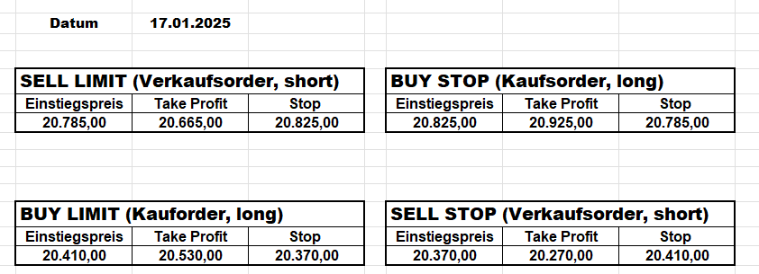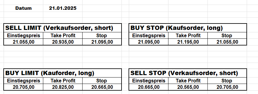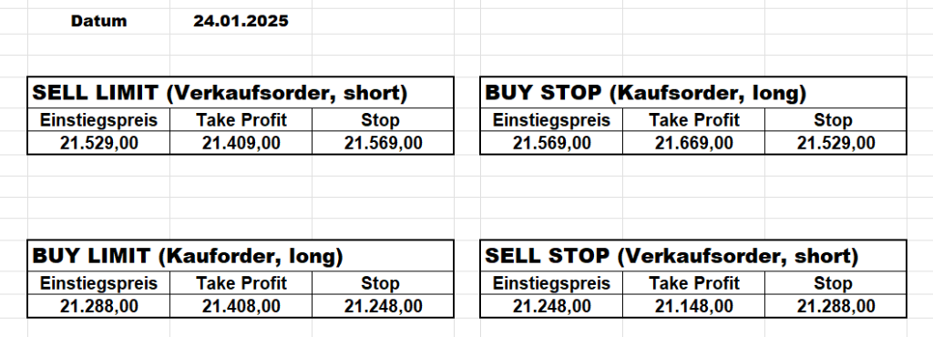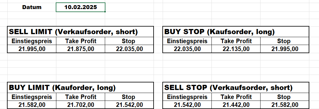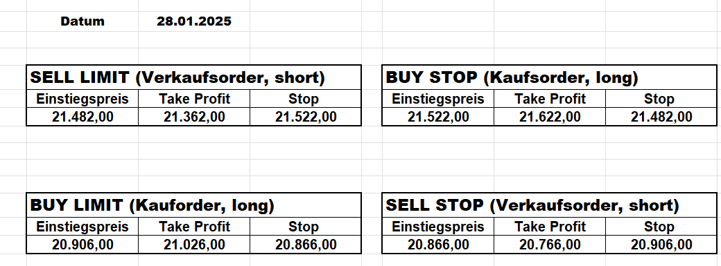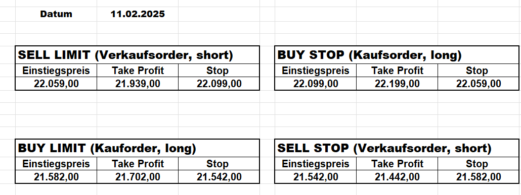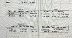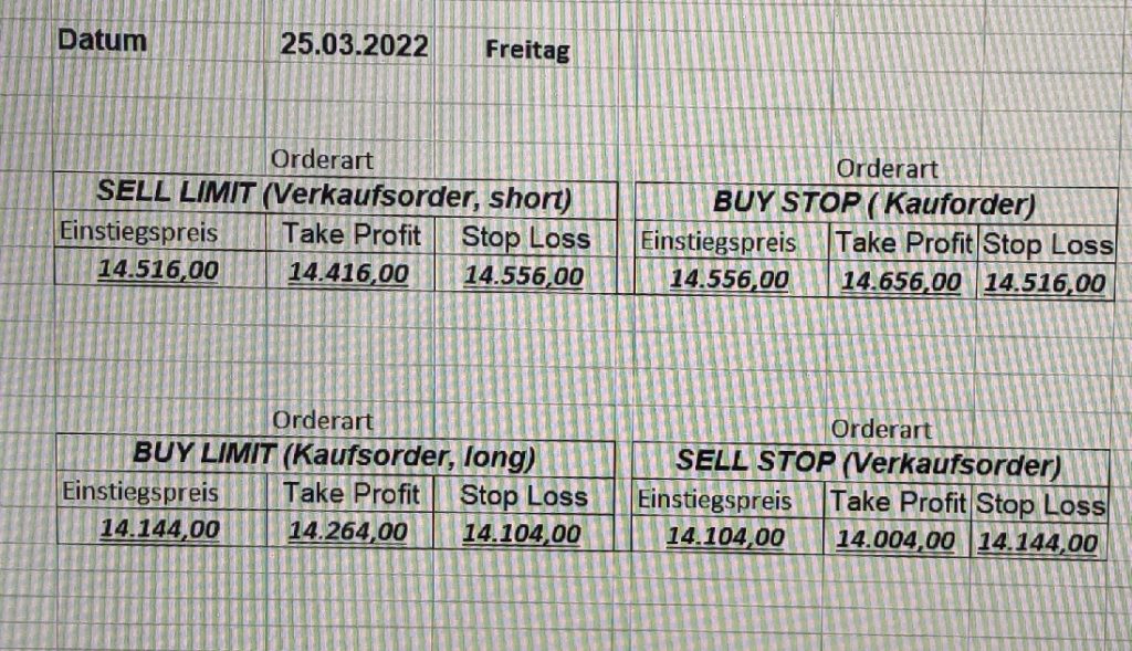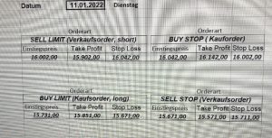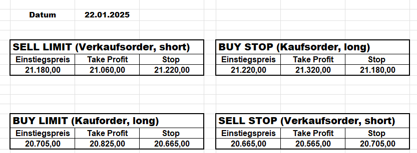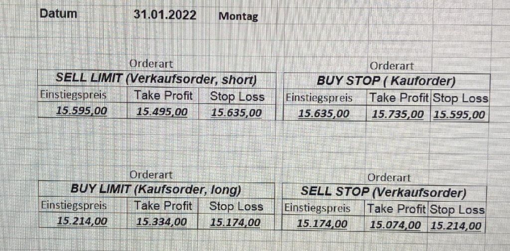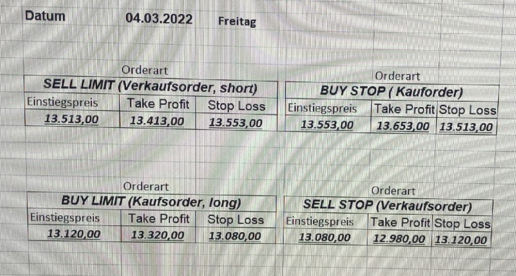 3.3.2022 Wir bleiben bei den Marken von gestern 2.3.2022: Achtung Wir legen uns bewusst an diesen Marken in den Markt. Wir brauchen Extrempunkte aufgrund der hohen Volatilität! Bitte platzieren Sie Ihre Order bis 9:00. Bitte wählen Sie Ihre Positionsgröße so, dass Sie bei einem Stopp nicht mehr als 0,5% bis 1% Ihres Depots riskieren!  1.3.2022:Russischer Konvoi auf dem Weg nach Kiew. Es wird volatil werden.  Wir planen einen Einstieg morgen, arbeiten gerade an den CRVs und Positionsgrößen, die wir verantworten können!  28.2.2022 Erneut sehen wir uns einer Eröffnung mit massivem Gap gegenüber. Das ist in der aktuellen Lage sicherlich nicht überraschend. Das Problem: Wir können aktuell keine Stopps setzen, die nur ansatzweise im Rahmen wären. Auch wenn es niemandem gefällt: Wir bleiben auch heute aus dem Markt!   25.2.2022 Wir werden mal am Montag, wenn das WE vorbei ist, „vorsichtig“ in den Markt gehen. Aktuell ist die Lage mehr als unübersichtlich. Denken Sie dran: Auch Handelsaussetzungen sind jederzeit möglich. Dann greifen auch die Stopps nicht mehr! 24.2.2022 Sollte klar sein, dass wir auch heute nicht in den Markt gehen! 23.2.2022 Auch heute bleiben wir noch aus dem Markt! Zu viel Volatilität! 22.2.2022 Aufgrund der aktuellen politischen Entwicklung in der Ukraine heute keine Signale! 21.2.2022 Bitte platzieren Sie Ihre Order bis 9:00. Bitte wählen Sie Ihre Positionsgröße so, dass Sie bei einem Stopp nicht mehr als 0,5% bis 1% Ihres Depots riskieren! 18.2.2022 Bitte platzieren Sie Ihre Order bis 9:00. Bitte wählen Sie Ihre Positionsgröße so, dass Sie bei einem Stopp nicht mehr als 0,5% bis 1% Ihres Depots riskieren! 17.2.2022 Bitte platzieren Sie Ihre Order bis 9:00. Bitte wählen Sie Ihre Positionsgröße so, dass Sie bei einem Stopp nicht mehr als 0,5% bis 1% Ihres Depots riskieren! 16.2.2022 Bitte platzieren Sie Ihre Order bis 9:00. Bitte wählen Sie Ihre Positionsgröße so, dass Sie bei einem Stopp nicht mehr als 0,5% bis 1% Ihres Depots riskieren! 15.2.2022 Bitte platzieren Sie Ihre Order bis 9:00. Bitte wählen Sie Ihre Positionsgröße so, dass Sie bei einem Stopp nicht mehr als 0,5% bis 1% Ihres Depots riskieren! 14.2.2022 Bitte platzieren Sie Ihre Order bis 9:00. Bitte wählen Sie Ihre Positionsgröße so, dass Sie bei einem Stopp nicht mehr als 0,5% bis 1% Ihres Depots riskieren! 11.2.2022 Bitte platzieren Sie Ihre Order bis 9:00. Bitte wählen Sie Ihre Positionsgröße so, dass Sie bei einem Stopp nicht mehr als 0,5% bis 1% Ihres Depots riskieren! 10.2.2022 Bitte platzieren Sie Ihre Order bis 9:00. Bitte wählen Sie Ihre Positionsgröße so, dass Sie bei einem Stopp nicht mehr als 0,5% bis 1% Ihres Depots riskieren! 9.2.2022 Bitte platzieren Sie Ihre Order bis 9:00. Bitte wählen Sie Ihre Positionsgröße so, dass Sie bei einem Stopp nicht mehr als 0,5% bis 1% Ihres Depots riskieren!   8.2.2022 Heute keine Signale mit gutem CRV zu ermitteln. Gestern war ja klasse, als der DAX nach unten durchbrach +120 Punkte! 7.2.2022 Bitte platzieren Sie Ihre Order bis 9:00. Bitte wählen Sie Ihre Positionsgröße so, dass Sie bei einem Stopp nicht mehr als 0,5% bis 1% Ihres Depots riskieren! 4.2.2022 Bitte platzieren Sie Ihre Order bis 9:00. Bitte wählen Sie Ihre Positionsgröße so, dass Sie bei einem Stopp nicht mehr als 0,5% bis 1% Ihres Depots riskieren! 3.2.2022 Bitte platzieren Sie Ihre Order bis 9:00. Bitte wählen Sie Ihre Positionsgröße so, dass Sie bei einem Stopp nicht mehr als 0,5% bis 1% Ihres Depots riskieren! 2.2.2022 Bitte platzieren Sie Ihre Order bis 9:00. Bitte wählen Sie Ihre Positionsgröße so, dass Sie bei einem Stopp nicht mehr als 0,5% bis 1% Ihres Depots riskieren! 1.2.2022 Bitte platzieren Sie Ihre Order bis 9:00. Bitte wählen Sie Ihre Positionsgröße so, dass Sie bei einem Stopp nicht mehr als 0,5% bis 1% Ihres Depots riskieren! 31.1.2022 Bitte platzieren Sie Ihre Order bis 9:00. Bitte wählen Sie Ihre Positionsgröße so, dass Sie bei einem Stopp nicht mehr als 0,5% bis 1% Ihres Depots riskieren! 28.1.2022 Bitte platzieren Sie Ihre Order bis 9:00. Bitte wählen Sie Ihre Positionsgröße so, dass Sie bei einem Stopp nicht mehr als 0,5% bis 1% Ihres Depots riskieren! 27.1.2022 Bitte platzieren Sie Ihre Order bis 9:00. Bitte wählen Sie Ihre Positionsgröße so, dass Sie bei einem Stopp nicht mehr als 0,5% bis 1% Ihres Depots riskieren! 26.1.2022 Bitte platzieren Sie Ihre Order bis 9:00. Bitte wählen Sie Ihre Positionsgröße so, dass Sie bei einem Stopp nicht mehr als 0,5% bis 1% Ihres Depots riskieren! 25.1.2022 Bitte platzieren Sie Ihre Order bis 9:00. Bitte wählen Sie Ihre Positionsgröße so, dass Sie bei einem Stopp nicht mehr als 0,5% bis 1% Ihres Depots riskieren! 24.1.2022 Bitte platzieren Sie Ihre Order bis 9:00. Bitte wählen Sie Ihre Positionsgröße so, dass Sie bei einem Stopp nicht mehr als 0,5% bis 1% Ihres Depots riskieren! 21.1.2022 Bitte platzieren Sie Ihre Order bis 9:00. Bitte wählen Sie Ihre Positionsgröße so, dass Sie bei einem Stopp nicht mehr als 0,5% bis 1% Ihres Depots riskieren! 20.1.2022   19.1.2022 itte platzieren Sie Ihre Order bis 9:00. Bitte wählen Sie Ihre Positionsgröße so, dass Sie bei einem Stopp nicht mehr als 0,5% bis 1% Ihres Depots riskieren! 18.1.2022 Heute ergaben sich keine Signale mit gutem CRV. Morgen geht es normal weiter! Bitte platzieren Sie Ihre Order bis 9:00. Bitte wählen Sie Ihre Positionsgröße so, dass Sie bei einem Stopp nicht mehr als 0,5% bis 1% Ihres Depots riskieren! Bitte platzieren Sie Ihre Order bis 9:00. Bitte wählen Sie Ihre Positionsgröße so, dass Sie bei einem Stopp nicht mehr als 0,5% bis 1% Ihres Depots riskieren! Bitte platzieren Sie Ihre Order bis 9:00. Bitte wählen Sie Ihre Positionsgröße so, dass Sie bei einem Stopp nicht mehr als 0,5% bis 1% Ihres Depots riskieren!     Bitte platzieren Sie Ihre Order bis 9:00. Bitte wählen Sie Ihre Positionsgröße so, dass Sie bei einem Stopp nicht mehr als 0,5% bis 1% Ihres Depots riskieren! 11.