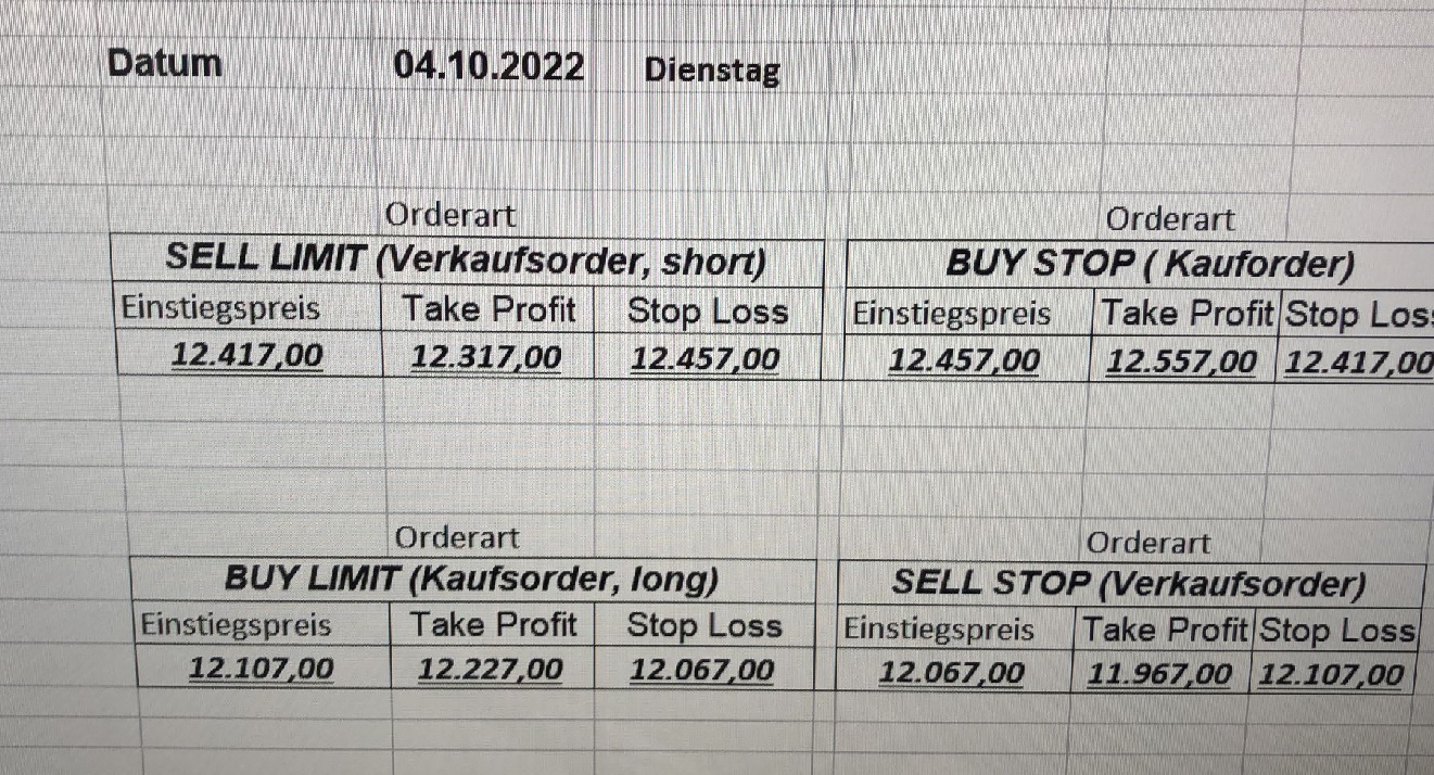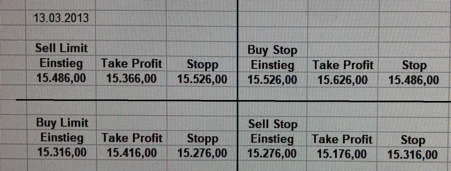 Platzieren Sie die  Order bis 9:00 Löschen Sie bitte offene Order und Positionen um 21:45 ! Zur Frage der Punktgröße: Beispielrechnung: Bitte immer kurz auf den am weitest entfernten Stopp schauen. Diese Punktzahl sollte nicht mehr als 0,5% bis 1% des Kapitals ausmachen.