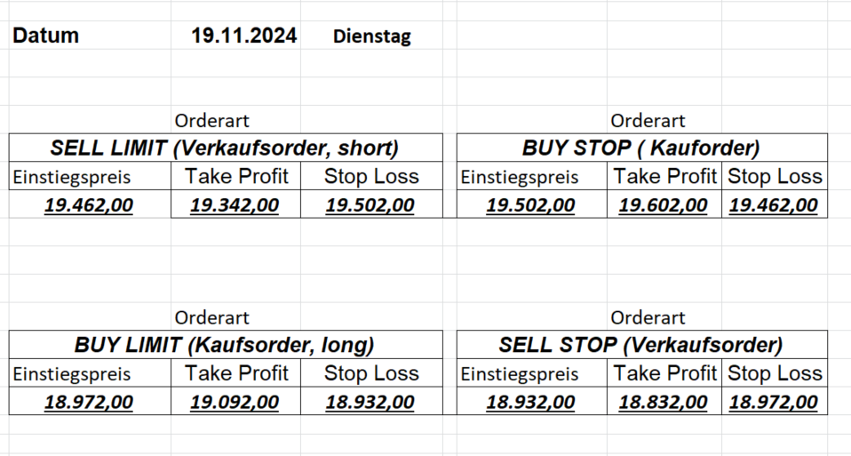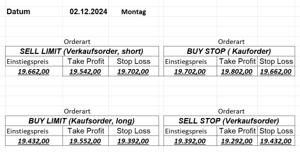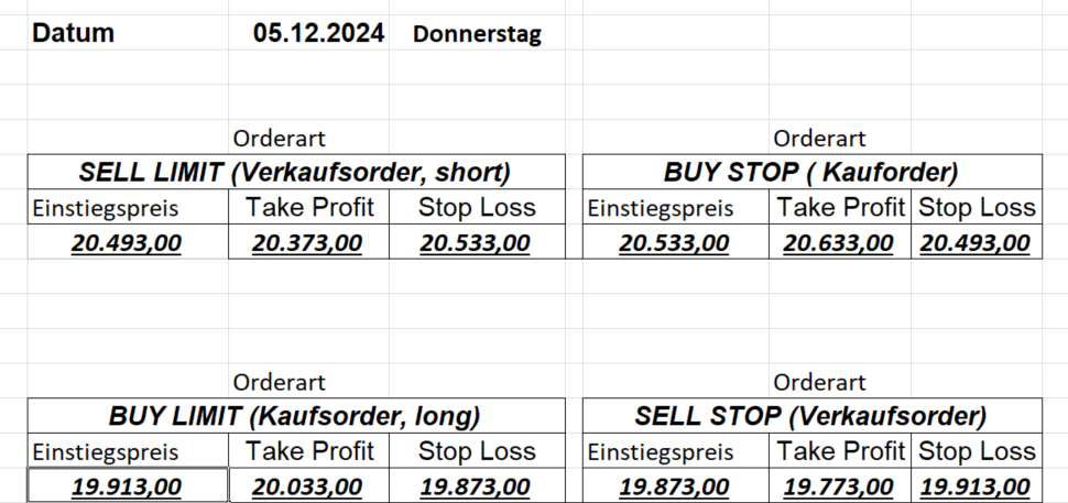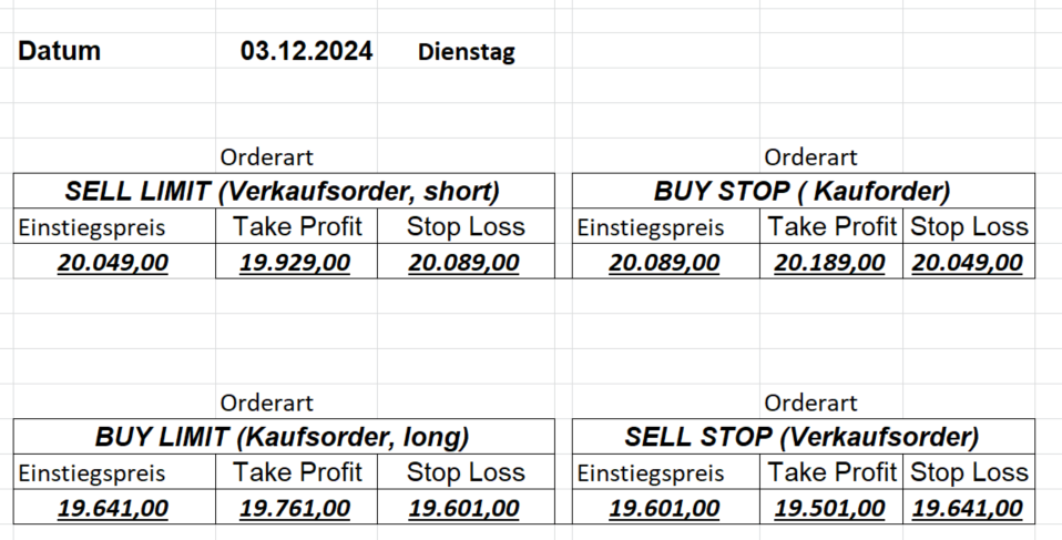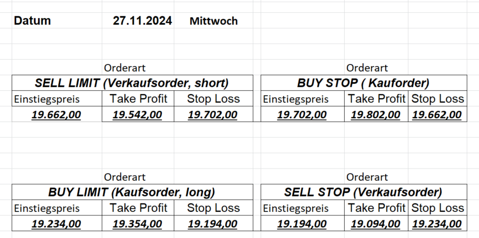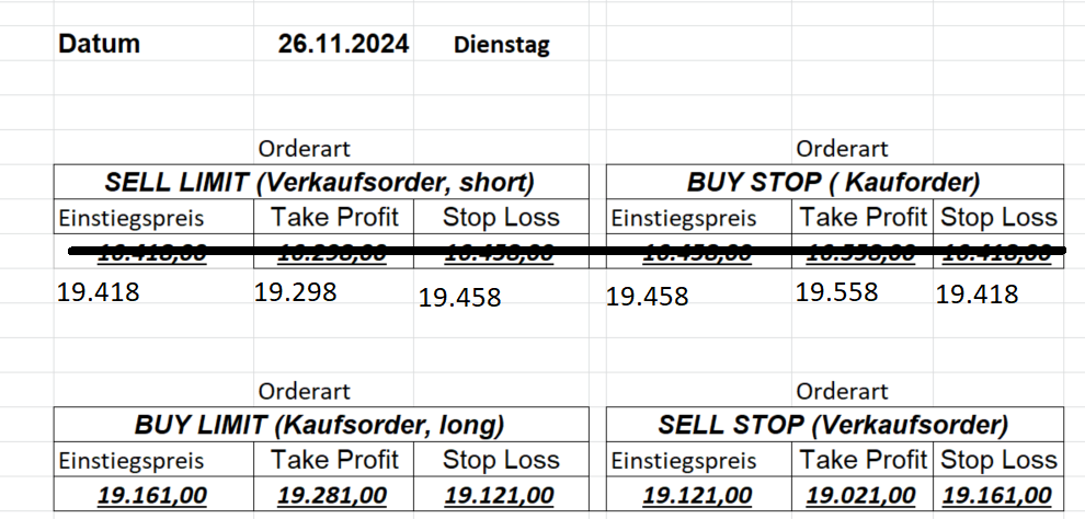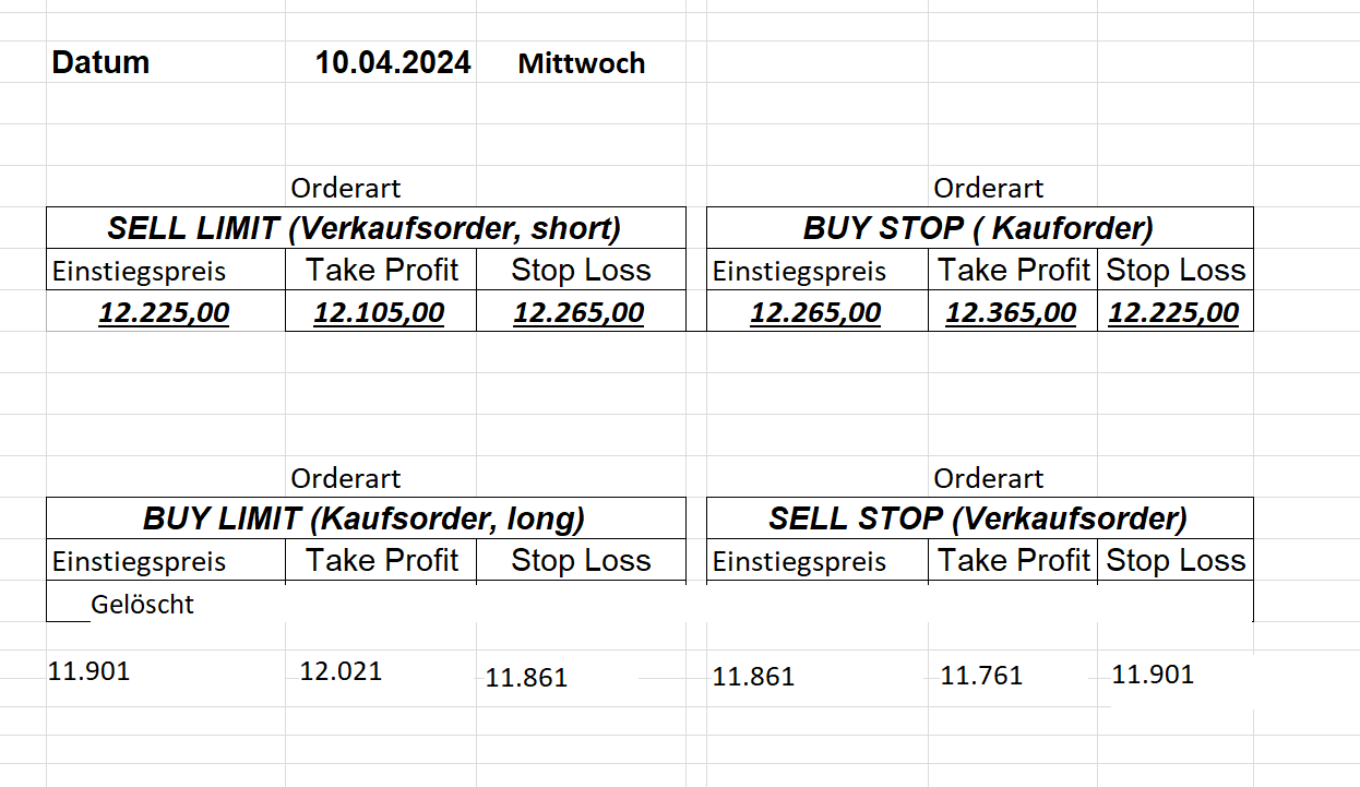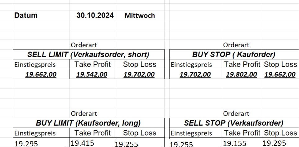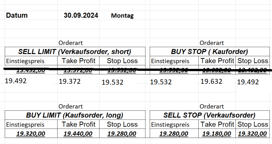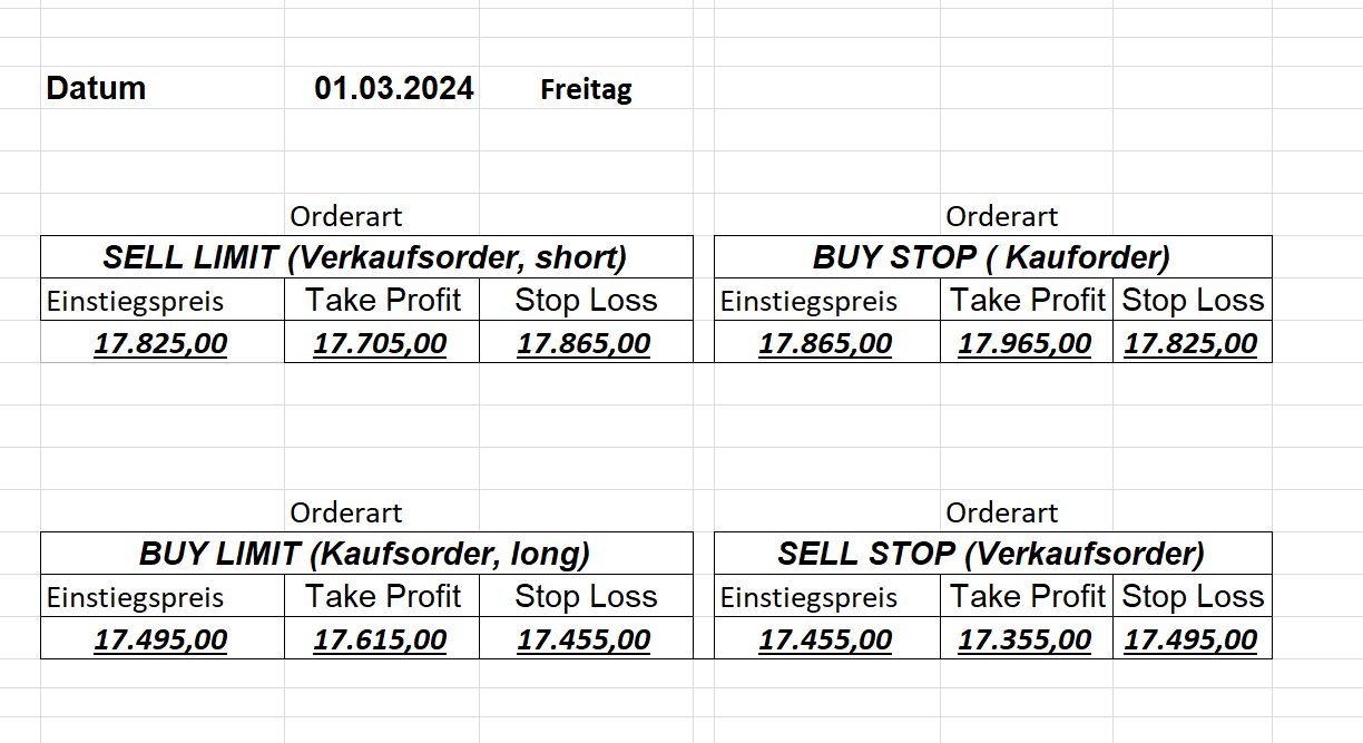 Platzieren Sie die  Order bis 9:00 Löschen Sie bitte offene Order und Positionen um 21:45 ! Zur Frage der Punktgröße: Beispielrechnung: Bitte immer kurz auf den am weitest entfernten Stopp schauen. Diese Punktzahl sollte nicht mehr als 0,5% bis 1% des Kapitals ausmachen.  26.3.2024 Platzieren Sie die  Order bis 9:00 Löschen Sie bitte offene Order und Positionen um 21:45 ! Zur Frage der Punktgröße: Beispielrechnung: Bitte immer kurz auf den am weitest entfernten Stopp schauen. Diese Punktzahl sollte nicht mehr als 0,5% bis 1% des Kapitals ausmachen.  25.3.2024 Platzieren Sie die  Order bis 9:00 Löschen Sie bitte offene Order und Positionen um 21:45 ! Zur Frage der Punktgröße: Beispielrechnung: Bitte immer kurz auf den am weitest entfernten Stopp schauen. Diese Punktzahl sollte nicht mehr als 0,5% bis 1% des Kapitals ausmachen.  22.3.2024 Platzieren Sie die  Order bis 9:00 Löschen Sie bitte offene Order und Positionen um 21:45 ! Zur Frage der Punktgröße: Beispielrechnung: Bitte immer kurz auf den am weitest entfernten Stopp schauen. Diese Punktzahl sollte nicht mehr als 0,5% bis 1% des Kapitals ausmachen.  21.3.2024 Heute keine Trades, das Gap (Kurslücke) ist zu groß! 20.3.2024 Platzieren Sie die  Order bis 9:00 Löschen Sie bitte offene Order und Positionen um 21:45 ! Zur Frage der Punktgröße: Beispielrechnung: Bitte immer kurz auf den am weitest entfernten Stopp schauen. Diese Punktzahl sollte nicht mehr als 0,5% bis 1% des Kapitals ausmachen.  19.3.2024 Platzieren Sie die  Order bis 9:00 Löschen Sie bitte offene Order und Positionen um 21:45 ! Zur Frage der Punktgröße: Beispielrechnung: Bitte immer kurz auf den am weitest entfernten Stopp schauen. Diese Punktzahl sollte nicht mehr als 0,5% bis 1% des Kapitals ausmachen.  18.3.2024 Platzieren Sie die  Order bis 9:00 Löschen Sie bitte offene Order und Positionen um 21:45 ! Zur Frage der Punktgröße: Beispielrechnung: Bitte immer kurz auf den am weitest entfernten Stopp schauen. Diese Punktzahl sollte nicht mehr als 0,5% bis 1% des Kapitals ausmachen.  15.3.2024 Platzieren Sie die  Order bis 9:00 Löschen Sie bitte offene Order und Positionen um 21:45 ! Zur Frage der Punktgröße: Beispielrechnung: Bitte immer kurz auf den am weitest entfernten Stopp schauen. Diese Punktzahl sollte nicht mehr als 0,5% bis 1% des Kapitals ausmachen.  14.3.2024 Platzieren Sie die  Order bis 9:00 Löschen Sie bitte offene Order und Positionen um 21:45 ! Zur Frage der Punktgröße: Beispielrechnung: Bitte immer kurz auf den am weitest entfernten Stopp schauen. Diese Punktzahl sollte nicht mehr als 0,5% bis 1% des Kapitals ausmachen.  13.3.2024 Platzieren Sie die  Order bis 9:00 Löschen Sie bitte offene Order und Positionen um 21:45 ! Zur Frage der Punktgröße: Beispielrechnung: Bitte immer kurz auf den am weitest entfernten Stopp schauen. Diese Punktzahl sollte nicht mehr als 0,5% bis 1% des Kapitals ausmachen.  12.3.2024 Platzieren Sie die  Order bis 9:00 Löschen Sie bitte offene Order und Positionen um 21:45 ! Zur Frage der Punktgröße: Beispielrechnung: Bitte immer kurz auf den am weitest entfernten Stopp schauen. Diese Punktzahl sollte nicht mehr als 0,5% bis 1% des Kapitals ausmachen.  11.3.2024 Platzieren Sie die  Order bis 9:00 Löschen Sie bitte offene Order und Positionen um 21:45 ! Zur Frage der Punktgröße: Beispielrechnung: Bitte immer kurz auf den am weitest entfernten Stopp schauen. Diese Punktzahl sollte nicht mehr als 0,5% bis 1% des Kapitals ausmachen.  8.3.2024 Platzieren Sie die  Order bis 9:00 Löschen Sie bitte offene Order und Positionen um 21:45 ! Zur Frage der Punktgröße: Beispielrechnung: Bitte immer kurz auf den am weitest entfernten Stopp schauen. Diese Punktzahl sollte nicht mehr als 0,5% bis 1% des Kapitals ausmachen.  6.03.2024 Platzieren Sie die  Order bis 9:00 Löschen Sie bitte offene Order und Positionen um 21:45 ! Zur Frage der Punktgröße: Beispielrechnung: Bitte immer kurz auf den am weitest entfernten Stopp schauen. Diese Punktzahl sollte nicht mehr als 0,5% bis 1% des Kapitals ausmachen.  Achtung: Morgen erscheinen aufgrund einer kleinen OP keine Signale!  5.3.2024 Heute konnten keine tragfähigen Signale ermittelt werden!  4.3.2024 Platzieren Sie die  Order bis 9:00 Löschen Sie bitte offene Order und Positionen um 21:45 ! Zur Frage der Punktgröße: Beispielrechnung: Bitte immer kurz auf den am weitest entfernten Stopp schauen. Diese Punktzahl sollte nicht mehr als 0,5% bis 1% des Kapitals ausmachen.  1.3.2024 Platzieren Sie die  Order bis 9:00 Löschen Sie bitte offene Order und Positionen um 21:45 ! Zur Frage der Punktgröße: Beispielrechnung: Bitte immer kurz auf den am weitest entfernten Stopp schauen. Diese Punktzahl sollte nicht mehr als 0,5% bis 1% des Kapitals ausmachen.  29.2.2024 Platzieren Sie die  Order bis 9:00 Löschen Sie bitte offene Order und Positionen um 21:45 ! Zur Frage der Punktgröße: Beispielrechnung: Bitte immer kurz auf den am weitest entfernten Stopp schauen. Diese Punktzahl sollte nicht mehr als 0,5% bis 1% des Kapitals ausmachen.  28.2.2024 Platzieren Sie die  Order bis 9:00 Löschen Sie bitte offene Order und Positionen um 21:45 ! Zur Frage der Punktgröße: Beispielrechnung: Bitte immer kurz auf den am weitest entfernten Stopp schauen. Diese Punktzahl sollte nicht mehr als 0,5% bis 1% des Kapitals ausmachen.  27.2.2024 Platzieren Sie die  Order bis 9:00 Löschen Sie bitte offene Order und Positionen um 21:45 ! Zur Frage der Punktgröße: Beispielrechnung: Bitte immer kurz auf den am weitest entfernten Stopp schauen. Diese Punktzahl sollte nicht mehr als 0,5% bis 1% des Kapitals ausmachen.  26.2.2024 Platzieren Sie die  Order bis 9:00 Löschen Sie bitte offene Order und Positionen um 21:45 ! Zur Frage der Punktgröße: Beispielrechnung: Bitte immer kurz auf den am weitest entfernten Stopp schauen. Diese Punktzahl sollte nicht mehr als 0,5% bis 1% des Kapitals ausmachen.  23.2.202
