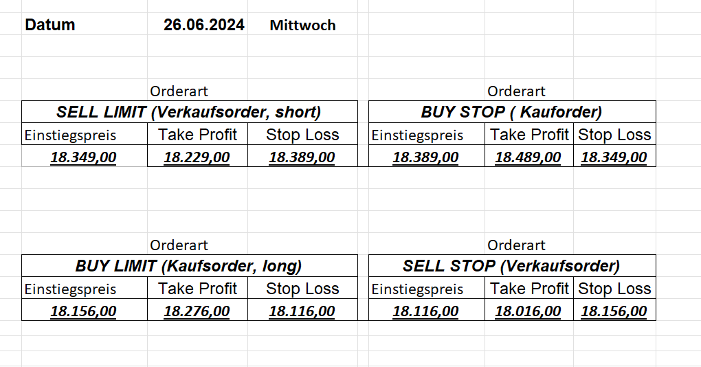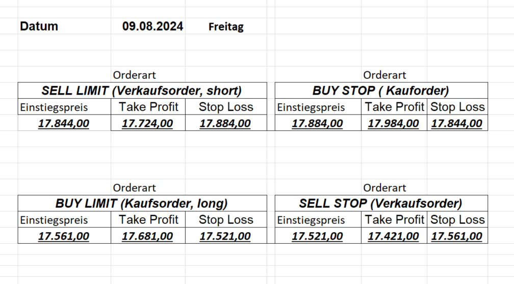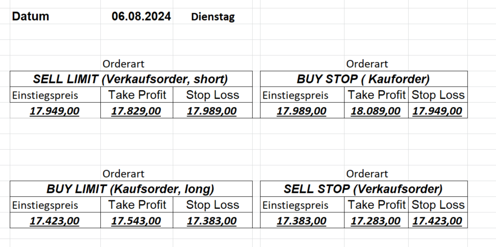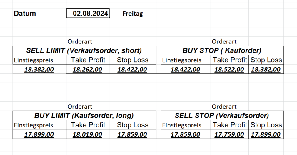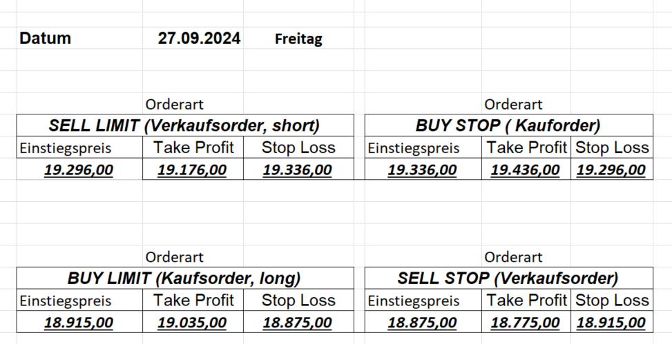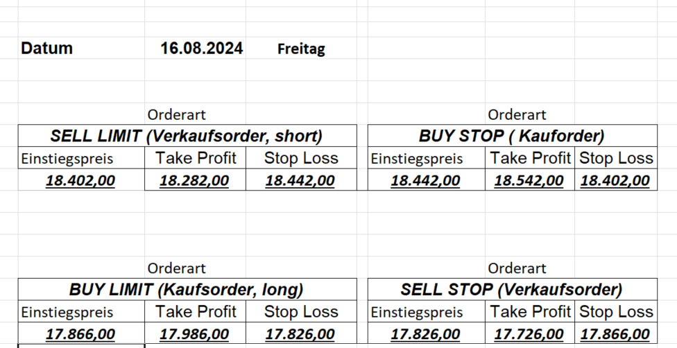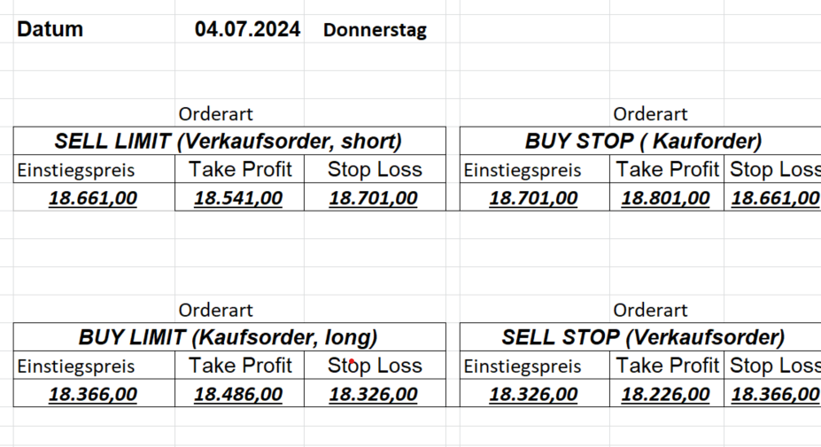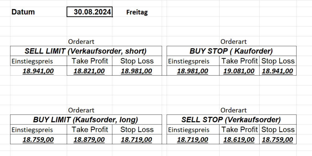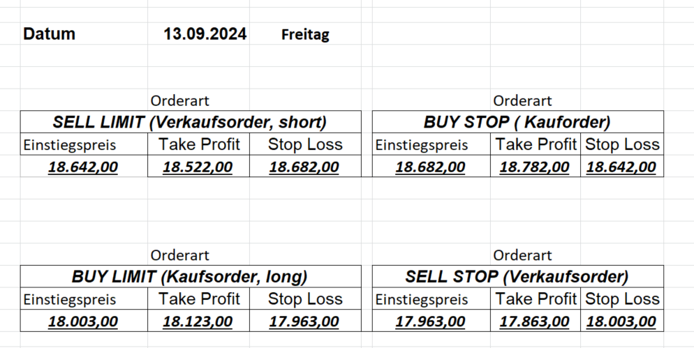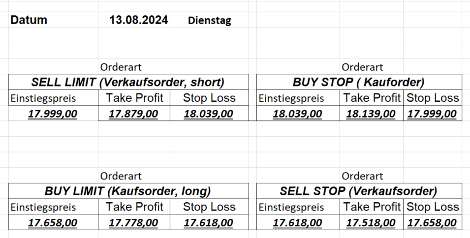 16.8.2024 Platzieren Sie die  Order bis 9:00 Löschen Sie bitte offene Order und Positionen um 21:45 ! Zur Frage der Punktgröße: Beispielrechnung: Bitte immer kurz auf den am weitest entfernten Stopp schauen. Diese Punktzahl sollte nicht mehr als 0,5% bis 1% des Kapitals ausmachen. 15.8.2024 Platzieren Sie die  Order bis 9:00 Löschen Sie bitte offene Order und Positionen um 21:45 ! Zur Frage der Punktgröße: Beispielrechnung: Bitte immer kurz auf den am weitest entfernten Stopp schauen. Diese Punktzahl sollte nicht mehr als 0,5% bis 1% des Kapitals ausmachen. 14.8.2024 Platzieren Sie die  Order bis 9:00 Löschen Sie bitte offene Order und Positionen um 21:45 ! Zur Frage der Punktgröße: Beispielrechnung: Bitte immer kurz auf den am weitest entfernten Stopp schauen. Diese Punktzahl sollte nicht mehr als 0,5% bis 1% des Kapitals ausmachen. 13.8.2024 Platzieren Sie die  Order bis 9:00 Löschen Sie bitte offene Order und Positionen um 21:45 ! Zur Frage der Punktgröße: Beispielrechnung: Bitte immer kurz auf den am weitest entfernten Stopp schauen. Diese Punktzahl sollte nicht mehr als 0,5% bis 1% des Kapitals ausmachen. 12.8.2024 Platzieren Sie die  Order bis 9:00 Löschen Sie bitte offene Order und Positionen um 21:45 ! Zur Frage der Punktgröße: Beispielrechnung: Bitte immer kurz auf den am weitest entfernten Stopp schauen. Diese Punktzahl sollte nicht mehr als 0,5% bis 1% des Kapitals ausmachen. 9.8.2024 Platzieren Sie die  Order bis 9:00 Löschen Sie bitte offene Order und Positionen um 21:45 ! Zur Frage der Punktgröße: Beispielrechnung: Bitte immer kurz auf den am weitest entfernten Stopp schauen. Diese Punktzahl sollte nicht mehr als 0,5% bis 1% des Kapitals ausmachen. 8.8.2024 Platzieren Sie die  Order bis 9:00 Löschen Sie bitte offene Order und Positionen um 21:45 ! Zur Frage der Punktgröße: Beispielrechnung: Bitte immer kurz auf den am weitest entfernten Stopp schauen. Diese Punktzahl sollte nicht mehr als 0,5% bis 1% des Kapitals ausmachen. 7.8.2024 Platzieren Sie die  Order bis 9:00 Löschen Sie bitte offene Order und Positionen um 21:45 ! Zur Frage der Punktgröße: Beispielrechnung: Bitte immer kurz auf den am weitest entfernten Stopp schauen. Diese Punktzahl sollte nicht mehr als 0,5% bis 1% des Kapitals ausmachen. 6.8.2024  Platzieren Sie die  Order bis 9:00 Löschen Sie bitte offene Order und Positionen um 21:45 ! Zur Frage der Punktgröße: Beispielrechnung: Bitte immer kurz auf den am weitest entfernten Stopp schauen. Diese Punktzahl sollte nicht mehr als 0,5% bis 1% des Kapitals ausmachen. 5.8.2024 Heute bleiben wir an der Seitenlinie. Gap Down von über 200 Punkten! 2.8.2024  Platzieren Sie die  Order bis 9:00 Löschen Sie bitte offene Order und Positionen um 21:45 ! Zur Frage der Punktgröße: Beispielrechnung: Bitte immer kurz auf den am weitest entfernten Stopp schauen. Diese Punktzahl sollte nicht mehr als 0,5% bis 1% des Kapitals ausmachen. 1.8.2024  Platzieren Sie die  Order bis 9:00 Löschen Sie bitte offene Order und Positionen um 21:45 ! Zur Frage der Punktgröße: Beispielrechnung: Bitte immer kurz auf den am weitest entfernten Stopp schauen. Diese Punktzahl sollte nicht mehr als 0,5% bis 1% des Kapitals ausmachen. 31.7.2024  Platzieren Sie die  Order bis 9:00 Löschen Sie bitte offene Order und Positionen um 21:45 ! Zur Frage der Punktgröße: Beispielrechnung: Bitte immer kurz auf den am weitest entfernten Stopp schauen. Diese Punktzahl sollte nicht mehr als 0,5% bis 1% des Kapitals ausmachen. 30.7.2024  Platzieren Sie die  Order bis 9:00 Löschen Sie bitte offene Order und Positionen um 21:45 ! Zur Frage der Punktgröße: Beispielrechnung: Bitte immer kurz auf den am weitest entfernten Stopp schauen. Diese Punktzahl sollte nicht mehr als 0,5% bis 1% des Kapitals ausmachen. 29.7.2024  Platzieren Sie die  Order bis 9:00 Löschen Sie bitte offene Order und Positionen um 21:45 ! Zur Frage der Punktgröße: Beispielrechnung: Bitte immer kurz auf den am weitest entfernten Stopp schauen. Diese Punktzahl sollte nicht mehr als 0,5% bis 1% des Kapitals ausmachen. Neues Allzeithoch im Depot:  26.7.2024  Platzieren Sie die  Order bis 9:00 Löschen Sie bitte offene Order und Positionen um 21:45 ! Zur Frage der Punktgröße: Beispielrechnung: Bitte immer kurz auf den am weitest entfernten Stopp schauen. Diese Punktzahl sollte nicht mehr als 0,5% bis 1% des Kapitals ausmachen. 25.7.2024  Platzieren Sie die  Order bis 9:00 Löschen Sie bitte offene Order und Positionen um 21:45 ! Zur Frage der Punktgröße: Beispielrechnung: Bitte immer kurz auf den am weitest entfernten Stopp schauen. Diese Punktzahl sollte nicht mehr als 0,5% bis 1% des Kapitals ausmachen. 24.7.2024 Platzieren Sie die  Order bis 9:00 Löschen Sie bitte offene Order und Positionen um 21:45 ! Zur Frage der Punktgröße: Beispielrechnung: Bitte immer kurz auf den am weitest entfernten Stopp schauen. Diese Punktzahl sollte nicht mehr als 0,5% bis 1% des Kapitals ausmachen. 23.7.2024 Platzieren Sie die  Order bis 9:00 Löschen Sie bitte offene Order und Positionen um 21:45 ! Zur Frage der Punktgröße: Beispielrechnung: Bitte immer kurz auf den am weitest entfernten Stopp schauen. Diese Punktzahl sollte nicht mehr als 0,5% bis 1% des Kapitals ausmachen. 22.7.2024 Heute bleiben wir an der Seitenlinie! Morgen geht es normal weiter!  19.7.2024 Platzieren Sie die  Order bis 9:00 Löschen Sie bitte offene Order und Positionen um 21:45 ! Zur Frage der Punktgröße: Beispielrechnung: Bitte immer kurz auf den am weitest entfernten Stopp schauen. Diese Punktzahl sollte nicht mehr als 0,5% bis 1% des Kapitals ausmachen. 18.7.2024 Aufgrund der heutigen EZB-Sitzung bleiben wir an der Seitenlinie!  17.7.2024 Platzieren Sie die  Order bis 9:00 Löschen Sie bitte offene Order und Positionen um 21:45 ! Zur Frage der Punktgröße: Beispielrechnung: Bitte immer kurz auf den am weitest entfernten Stopp schauen. Diese Punktzahl sollte nicht mehr als