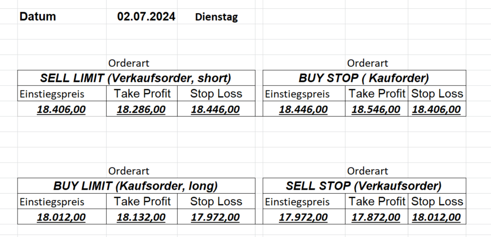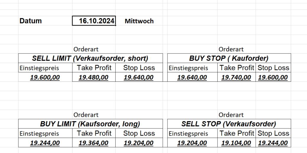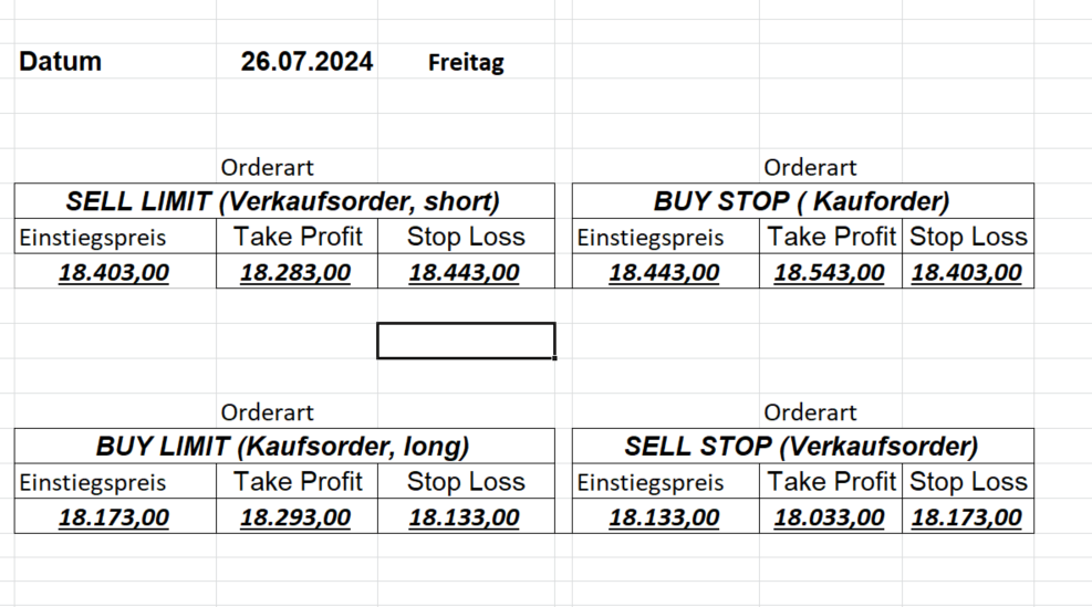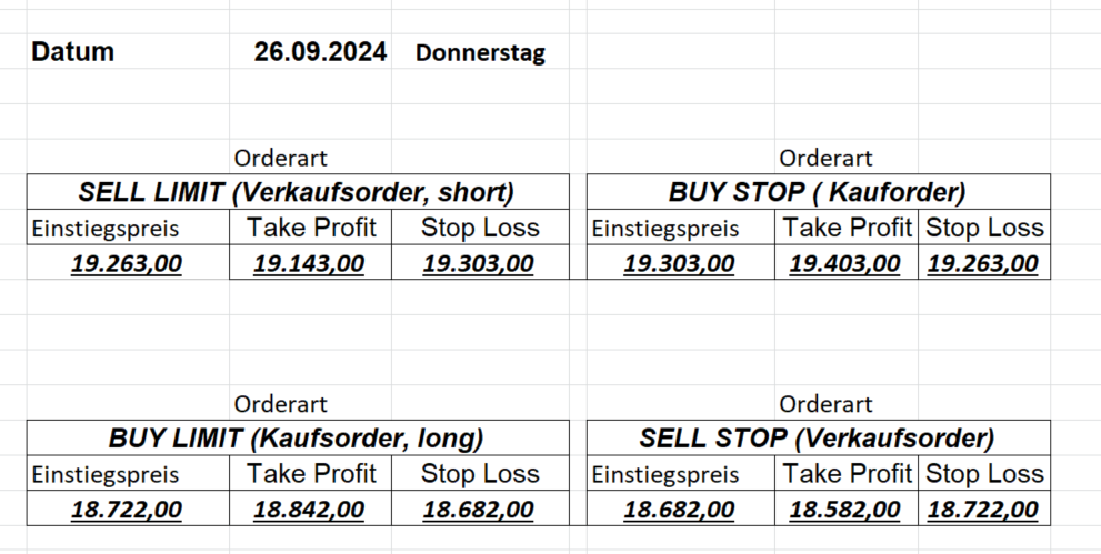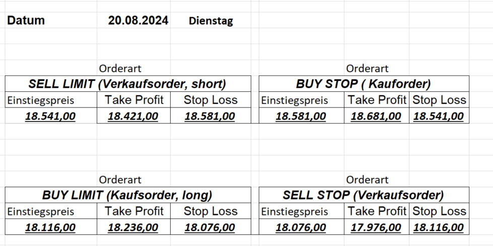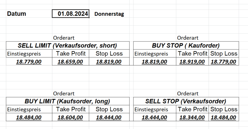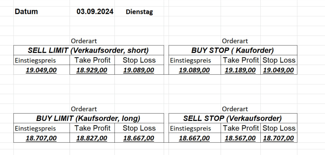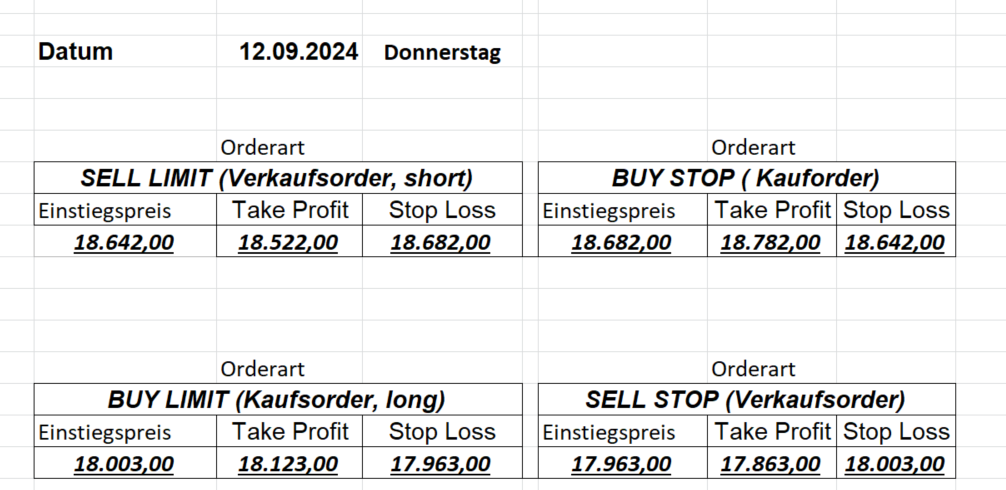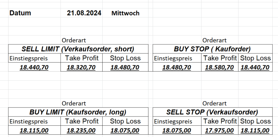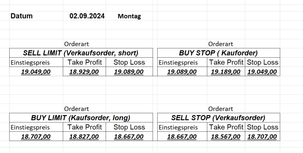 16.8.2024 Platzieren Sie die  Order bis 9:00 Löschen Sie bitte offene Order und Positionen um 21:45 ! Zur Frage der Punktgröße: Beispielrechnung: Bitte immer kurz auf den am weitest entfernten Stopp schauen. Diese Punktzahl sollte nicht mehr als 0,5% bis 1% des Kapitals ausmachen. 15.8.2024 Platzieren Sie die  Order bis 9:00 Löschen Sie bitte offene Order und Positionen um 21:45 ! Zur Frage der Punktgröße: Beispielrechnung: Bitte immer kurz auf den am weitest entfernten Stopp schauen. Diese Punktzahl sollte nicht mehr als 0,5% bis 1% des Kapitals ausmachen. 14.8.2024 Platzieren Sie die  Order bis 9:00 Löschen Sie bitte offene Order und Positionen um 21:45 ! Zur Frage der Punktgröße: Beispielrechnung: Bitte immer kurz auf den am weitest entfernten Stopp schauen. Diese Punktzahl sollte nicht mehr als 0,5% bis 1% des Kapitals ausmachen. 13.8.2024 Platzieren Sie die  Order bis 9:00 Löschen Sie bitte offene Order und Positionen um 21:45 ! Zur Frage der Punktgröße: Beispielrechnung: Bitte immer kurz auf den am weitest entfernten Stopp schauen. Diese Punktzahl sollte nicht mehr als 0,5% bis 1% des Kapitals ausmachen. 12.8.2024 Platzieren Sie die  Order bis 9:00 Löschen Sie bitte offene Order und Positionen um 21:45 ! Zur Frage der Punktgröße: Beispielrechnung: Bitte immer kurz auf den am weitest entfernten Stopp schauen. Diese Punktzahl sollte nicht mehr als 0,5% bis 1% des Kapitals ausmachen. 9.8.2024 Platzieren Sie die  Order bis 9:00 Löschen Sie bitte offene Order und Positionen um 21:45 ! Zur Frage der Punktgröße: Beispielrechnung: Bitte immer kurz auf den am weitest entfernten Stopp schauen. Diese Punktzahl sollte nicht mehr als 0,5% bis 1% des Kapitals ausmachen. 8.8.2024 Platzieren Sie die  Order bis 9:00 Löschen Sie bitte offene Order und Positionen um 21:45 ! Zur Frage der Punktgröße: Beispielrechnung: Bitte immer kurz auf den am weitest entfernten Stopp schauen. Diese Punktzahl sollte nicht mehr als 0,5% bis 1% des Kapitals ausmachen. 7.8.2024 Platzieren Sie die  Order bis 9:00 Löschen Sie bitte offene Order und Positionen um 21:45 ! Zur Frage der Punktgröße: Beispielrechnung: Bitte immer kurz auf den am weitest entfernten Stopp schauen. Diese Punktzahl sollte nicht mehr als 0,5% bis 1% des Kapitals ausmachen. 6.8.2024  Platzieren Sie die  Order bis 9:00 Löschen Sie bitte offene Order und Positionen um 21:45 ! Zur Frage der Punktgröße: Beispielrechnung: Bitte immer kurz auf den am weitest entfernten Stopp schauen. Diese Punktzahl sollte nicht mehr als 0,5% bis 1% des Kapitals ausmachen. 5.8.2024 Heute bleiben wir an der Seitenlinie. Gap Down von über 200 Punkten! 2.8.2024  Platzieren Sie die  Order bis 9:00 Löschen Sie bitte offene Order und Positionen um 21:45 ! Zur Frage der Punktgröße: Beispielrechnung: Bitte immer kurz auf den am weitest entfernten Stopp schauen. Diese Punktzahl sollte nicht mehr als 0,5% bis 1% des Kapitals ausmachen. 1.8.2024  Platzieren Sie die  Order bis 9:00 Löschen Sie bitte offene Order und Positionen um 21:45 ! Zur Frage der Punktgröße: Beispielrechnung: Bitte immer kurz auf den am weitest entfernten Stopp schauen. Diese Punktzahl sollte nicht mehr als 0,5% bis 1% des Kapitals ausmachen. 31.7.2024  Platzieren Sie die  Order bis 9:00 Löschen Sie bitte offene Order und Positionen um 21:45 ! Zur Frage der Punktgröße: Beispielrechnung: Bitte immer kurz auf den am weitest entfernten Stopp schauen. Diese Punktzahl sollte nicht mehr als 0,5% bis 1% des Kapitals ausmachen. 30.7.2024  Platzieren Sie die  Order bis 9:00 Löschen Sie bitte offene Order und Positionen um 21:45 ! Zur Frage der Punktgröße: Beispielrechnung: Bitte immer kurz auf den am weitest entfernten Stopp schauen. Diese Punktzahl sollte nicht mehr als 0,5% bis 1% des Kapitals ausmachen. 29.7.2024  Platzieren Sie die  Order bis 9:00 Löschen Sie bitte offene Order und Positionen um 21:45 ! Zur Frage der Punktgröße: Beispielrechnung: Bitte immer kurz auf den am weitest entfernten Stopp schauen. Diese Punktzahl sollte nicht mehr als 0,5% bis 1% des Kapitals ausmachen. Neues Allzeithoch im Depot:  26.7.2024  Platzieren Sie die  Order bis 9:00 Löschen Sie bitte offene Order und Positionen um 21:45 ! Zur Frage der Punktgröße: Beispielrechnung: Bitte immer kurz auf den am weitest entfernten Stopp schauen. Diese Punktzahl sollte nicht mehr als 0,5% bis 1% des Kapitals ausmachen. 25.7.2024  Platzieren Sie die  Order bis 9:00 Löschen Sie bitte offene Order und Positionen um 21:45 ! Zur Frage der Punktgröße: Beispielrechnung: Bitte immer kurz auf den am weitest entfernten Stopp schauen. Diese Punktzahl sollte nicht mehr als 0,5% bis 1% des Kapitals ausmachen. 24.7.2024 Platzieren Sie die  Order bis 9:00 Löschen Sie bitte offene Order und Positionen um 21:45 ! Zur Frage der Punktgröße: Beispielrechnung: Bitte immer kurz auf den am weitest entfernten Stopp schauen. Diese Punktzahl sollte nicht mehr als 0,5% bis 1% des Kapitals ausmachen. 23.7.2024 Platzieren Sie die  Order bis 9:00 Löschen Sie bitte offene Order und Positionen um 21:45 ! Zur Frage der Punktgröße: Beispielrechnung: Bitte immer kurz auf den am weitest entfernten Stopp schauen. Diese Punktzahl sollte nicht mehr als 0,5% bis 1% des Kapitals ausmachen. 22.7.2024 Heute bleiben wir an der Seitenlinie! Morgen geht es normal weiter!  19.7.2024 Platzieren Sie die  Order bis 9:00 Löschen Sie bitte offene Order und Positionen um 21:45 ! Zur Frage der Punktgröße: Beispielrechnung: Bitte immer kurz auf den am weitest entfernten Stopp schauen. Diese Punktzahl sollte nicht mehr als 0,5% bis 1% des Kapitals ausmachen. 18.7.2024 Aufgrund der heutigen EZB-Sitzung bleiben wir an der Seitenlinie!  17.7.2024 Platzieren Sie die  Order bis 9:00 Löschen Sie bitte offene Order und Positionen um 21:45 ! Zur Frage der Punktgröße: Beispielrechnung: Bitte immer kurz auf den am weitest entfernten Stopp schauen. Diese Punktzahl sollte nicht mehr als