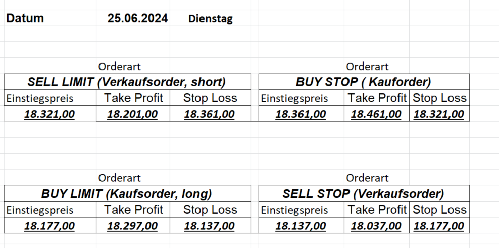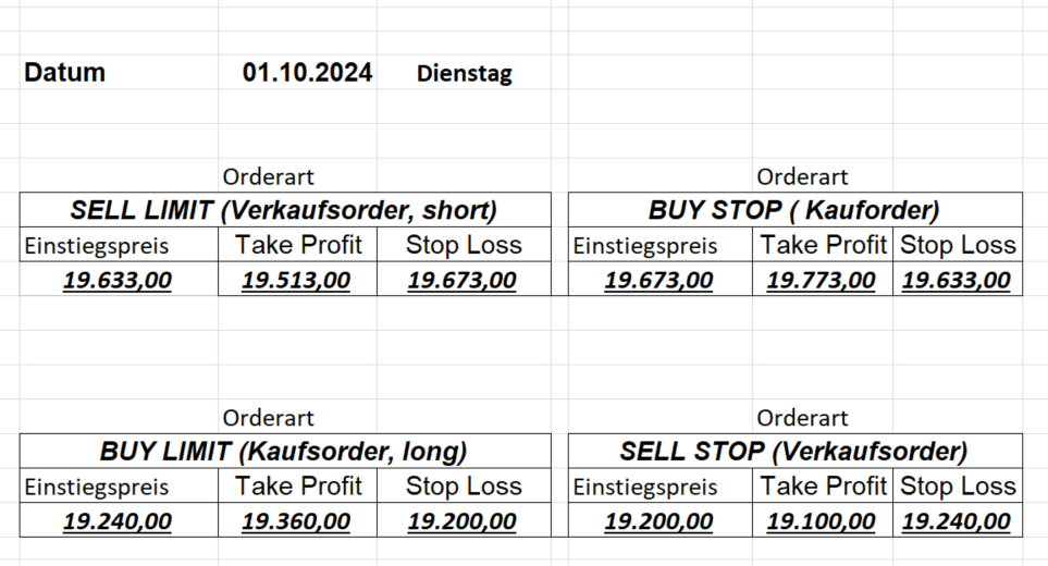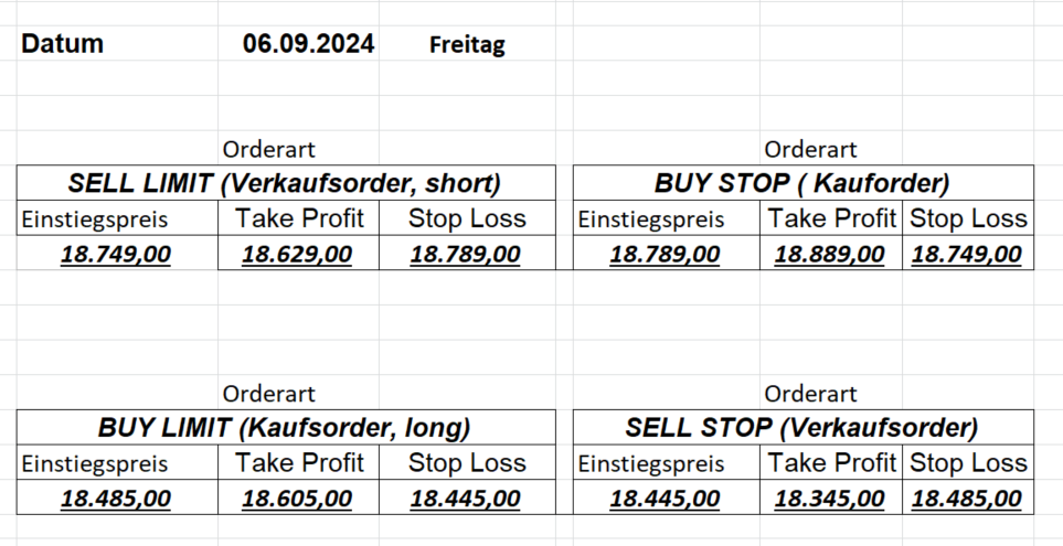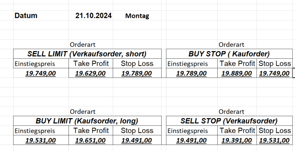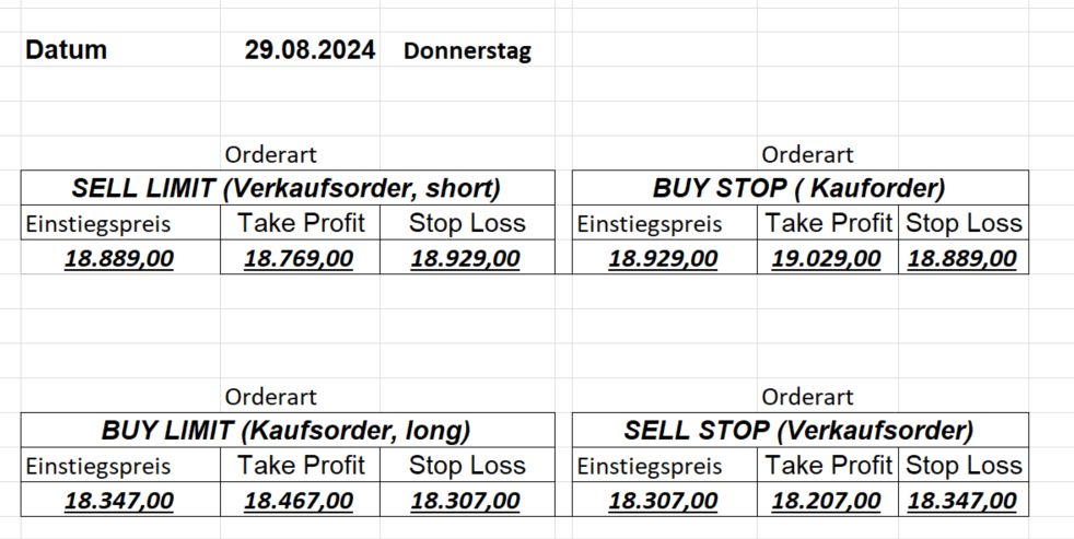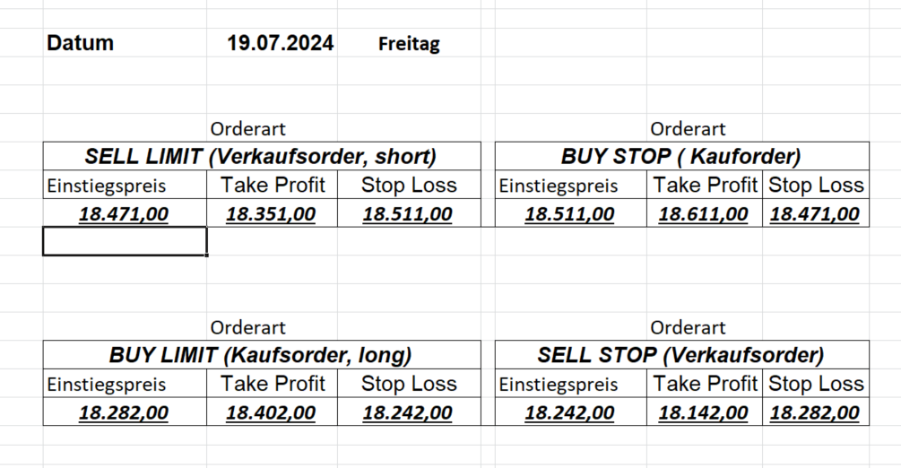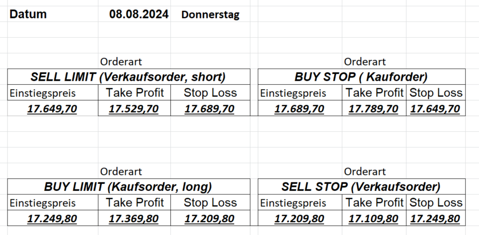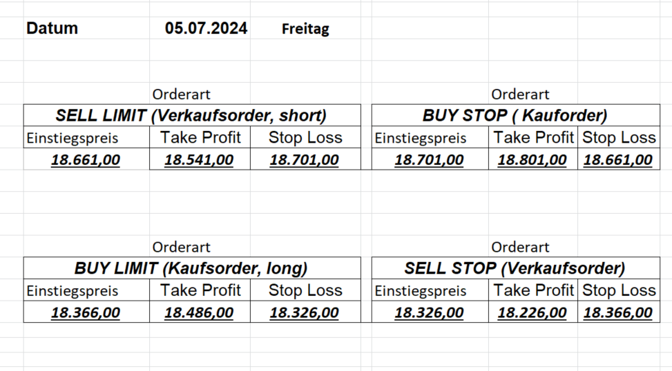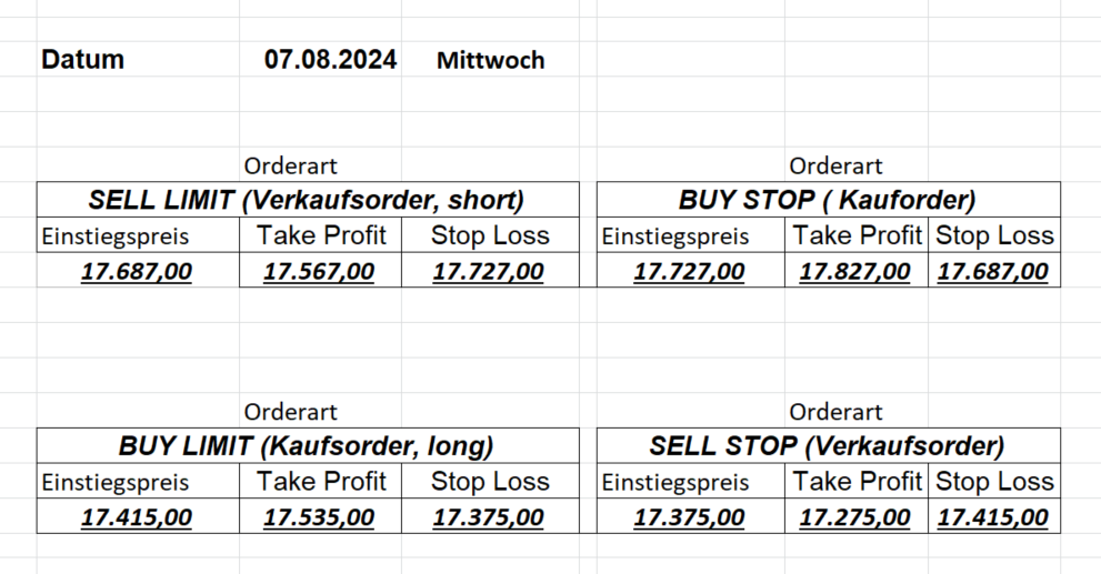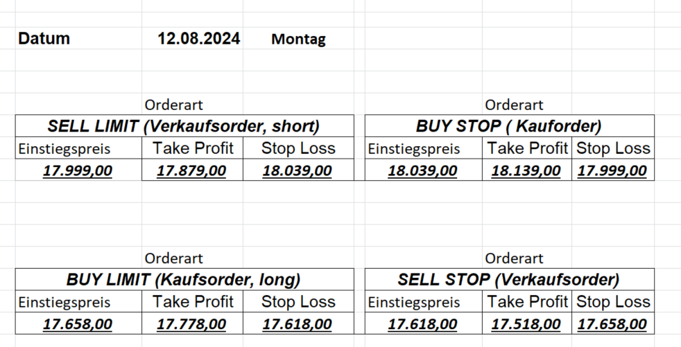 16.8.2024 Platzieren Sie die  Order bis 9:00 Löschen Sie bitte offene Order und Positionen um 21:45 ! Zur Frage der Punktgröße: Beispielrechnung: Bitte immer kurz auf den am weitest entfernten Stopp schauen. Diese Punktzahl sollte nicht mehr als 0,5% bis 1% des Kapitals ausmachen. 15.8.2024 Platzieren Sie die  Order bis 9:00 Löschen Sie bitte offene Order und Positionen um 21:45 ! Zur Frage der Punktgröße: Beispielrechnung: Bitte immer kurz auf den am weitest entfernten Stopp schauen. Diese Punktzahl sollte nicht mehr als 0,5% bis 1% des Kapitals ausmachen. 14.8.2024 Platzieren Sie die  Order bis 9:00 Löschen Sie bitte offene Order und Positionen um 21:45 ! Zur Frage der Punktgröße: Beispielrechnung: Bitte immer kurz auf den am weitest entfernten Stopp schauen. Diese Punktzahl sollte nicht mehr als 0,5% bis 1% des Kapitals ausmachen. 13.8.2024 Platzieren Sie die  Order bis 9:00 Löschen Sie bitte offene Order und Positionen um 21:45 ! Zur Frage der Punktgröße: Beispielrechnung: Bitte immer kurz auf den am weitest entfernten Stopp schauen. Diese Punktzahl sollte nicht mehr als 0,5% bis 1% des Kapitals ausmachen. 12.8.2024 Platzieren Sie die  Order bis 9:00 Löschen Sie bitte offene Order und Positionen um 21:45 ! Zur Frage der Punktgröße: Beispielrechnung: Bitte immer kurz auf den am weitest entfernten Stopp schauen. Diese Punktzahl sollte nicht mehr als 0,5% bis 1% des Kapitals ausmachen. 9.8.2024 Platzieren Sie die  Order bis 9:00 Löschen Sie bitte offene Order und Positionen um 21:45 ! Zur Frage der Punktgröße: Beispielrechnung: Bitte immer kurz auf den am weitest entfernten Stopp schauen. Diese Punktzahl sollte nicht mehr als 0,5% bis 1% des Kapitals ausmachen. 8.8.2024 Platzieren Sie die  Order bis 9:00 Löschen Sie bitte offene Order und Positionen um 21:45 ! Zur Frage der Punktgröße: Beispielrechnung: Bitte immer kurz auf den am weitest entfernten Stopp schauen. Diese Punktzahl sollte nicht mehr als 0,5% bis 1% des Kapitals ausmachen. 7.8.2024 Platzieren Sie die  Order bis 9:00 Löschen Sie bitte offene Order und Positionen um 21:45 ! Zur Frage der Punktgröße: Beispielrechnung: Bitte immer kurz auf den am weitest entfernten Stopp schauen. Diese Punktzahl sollte nicht mehr als 0,5% bis 1% des Kapitals ausmachen. 6.8.2024  Platzieren Sie die  Order bis 9:00 Löschen Sie bitte offene Order und Positionen um 21:45 ! Zur Frage der Punktgröße: Beispielrechnung: Bitte immer kurz auf den am weitest entfernten Stopp schauen. Diese Punktzahl sollte nicht mehr als 0,5% bis 1% des Kapitals ausmachen. 5.8.2024 Heute bleiben wir an der Seitenlinie. Gap Down von über 200 Punkten! 2.8.2024  Platzieren Sie die  Order bis 9:00 Löschen Sie bitte offene Order und Positionen um 21:45 ! Zur Frage der Punktgröße: Beispielrechnung: Bitte immer kurz auf den am weitest entfernten Stopp schauen. Diese Punktzahl sollte nicht mehr als 0,5% bis 1% des Kapitals ausmachen. 1.8.2024  Platzieren Sie die  Order bis 9:00 Löschen Sie bitte offene Order und Positionen um 21:45 ! Zur Frage der Punktgröße: Beispielrechnung: Bitte immer kurz auf den am weitest entfernten Stopp schauen. Diese Punktzahl sollte nicht mehr als 0,5% bis 1% des Kapitals ausmachen. 31.7.2024  Platzieren Sie die  Order bis 9:00 Löschen Sie bitte offene Order und Positionen um 21:45 ! Zur Frage der Punktgröße: Beispielrechnung: Bitte immer kurz auf den am weitest entfernten Stopp schauen. Diese Punktzahl sollte nicht mehr als 0,5% bis 1% des Kapitals ausmachen. 30.7.2024  Platzieren Sie die  Order bis 9:00 Löschen Sie bitte offene Order und Positionen um 21:45 ! Zur Frage der Punktgröße: Beispielrechnung: Bitte immer kurz auf den am weitest entfernten Stopp schauen. Diese Punktzahl sollte nicht mehr als 0,5% bis 1% des Kapitals ausmachen. 29.7.2024  Platzieren Sie die  Order bis 9:00 Löschen Sie bitte offene Order und Positionen um 21:45 ! Zur Frage der Punktgröße: Beispielrechnung: Bitte immer kurz auf den am weitest entfernten Stopp schauen. Diese Punktzahl sollte nicht mehr als 0,5% bis 1% des Kapitals ausmachen. Neues Allzeithoch im Depot:  26.7.2024  Platzieren Sie die  Order bis 9:00 Löschen Sie bitte offene Order und Positionen um 21:45 ! Zur Frage der Punktgröße: Beispielrechnung: Bitte immer kurz auf den am weitest entfernten Stopp schauen. Diese Punktzahl sollte nicht mehr als 0,5% bis 1% des Kapitals ausmachen. 25.7.2024  Platzieren Sie die  Order bis 9:00 Löschen Sie bitte offene Order und Positionen um 21:45 ! Zur Frage der Punktgröße: Beispielrechnung: Bitte immer kurz auf den am weitest entfernten Stopp schauen. Diese Punktzahl sollte nicht mehr als 0,5% bis 1% des Kapitals ausmachen. 24.7.2024 Platzieren Sie die  Order bis 9:00 Löschen Sie bitte offene Order und Positionen um 21:45 ! Zur Frage der Punktgröße: Beispielrechnung: Bitte immer kurz auf den am weitest entfernten Stopp schauen. Diese Punktzahl sollte nicht mehr als 0,5% bis 1% des Kapitals ausmachen. 23.7.2024 Platzieren Sie die  Order bis 9:00 Löschen Sie bitte offene Order und Positionen um 21:45 ! Zur Frage der Punktgröße: Beispielrechnung: Bitte immer kurz auf den am weitest entfernten Stopp schauen. Diese Punktzahl sollte nicht mehr als 0,5% bis 1% des Kapitals ausmachen. 22.7.2024 Heute bleiben wir an der Seitenlinie! Morgen geht es normal weiter!  19.7.2024 Platzieren Sie die  Order bis 9:00 Löschen Sie bitte offene Order und Positionen um 21:45 ! Zur Frage der Punktgröße: Beispielrechnung: Bitte immer kurz auf den am weitest entfernten Stopp schauen. Diese Punktzahl sollte nicht mehr als 0,5% bis 1% des Kapitals ausmachen. 18.7.2024 Aufgrund der heutigen EZB-Sitzung bleiben wir an der Seitenlinie!  17.7.2024 Platzieren Sie die  Order bis 9:00 Löschen Sie bitte offene Order und Positionen um 21:45 ! Zur Frage der Punktgröße: Beispielrechnung: Bitte immer kurz auf den am weitest entfernten Stopp schauen. Diese Punktzahl sollte nicht mehr als