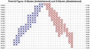 In der Welt von Point & Figure gibt es keine Kerzenkörper oder Dochte. Hier regieren zwei Symbole: Das X steht für steigende Preise und zeigt uns, dass die Bullen das Ruder fest in der Hand halten. Jedes X ist ein kleiner Sieg der Käufer. Im Gegensatz dazu markiert das O fallende Kurse und spiegelt die Dominanz der Bären wider.