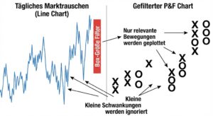 Durch diese Mechanik verschwindet das tägliche Marktrauschen fast wie von Zauberhand. Während andere Trader bei jedem kleinen Kurshüpfer nervös werden, bleibt Ihr Point & Figure Chart ungerührt, bis eine echte Relevanz erreicht ist. Sie handeln nicht mehr auf Basis von Hektik, sondern auf Basis von Substanz. Diese Objektivität macht die Methode zu einem der ehrlichsten Werkzeuge der technischen Analyse.