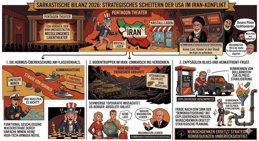 Willkommen im Jahr 2026, in dem die US-Politik gegenüber dem Iran eher an ein misslungenes Laientheater erinnert. Während die USA und Israel versuchen, den Iran mit der Präzision eines Vorschlaghammers im Kristallladen „umzugestalten“, scheint im Pentagon jemand die Geografie-Lektion über die Straße von Hormus geschwänzt zu haben. Dass der Iran die wichtigste Öl-Ader der Welt tatsächlich abklemmt, wenn man ihn bombardiert, trifft Washington völlig unvorbereitet – eine strategische Leistung, die man sonst nur kurz vor der Sperrstunde in Kneipen findet.